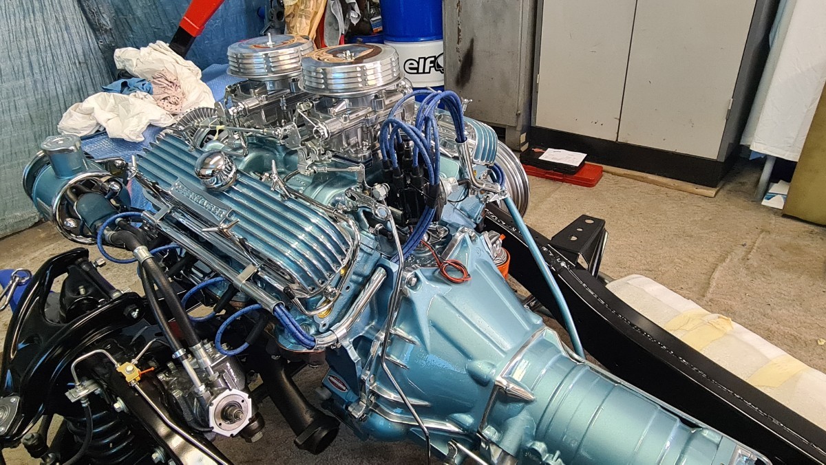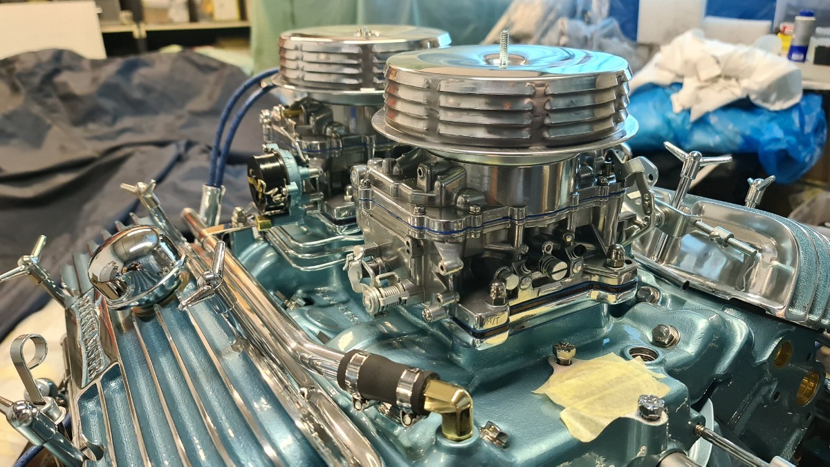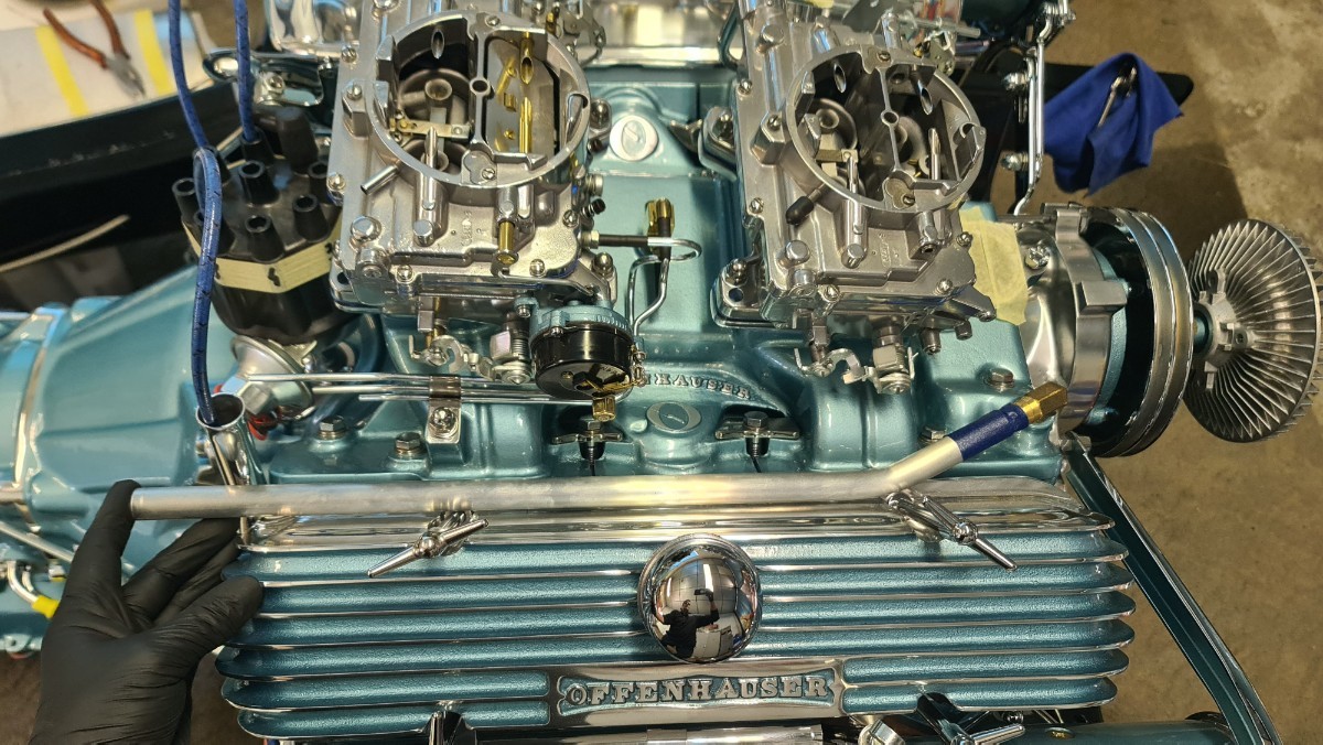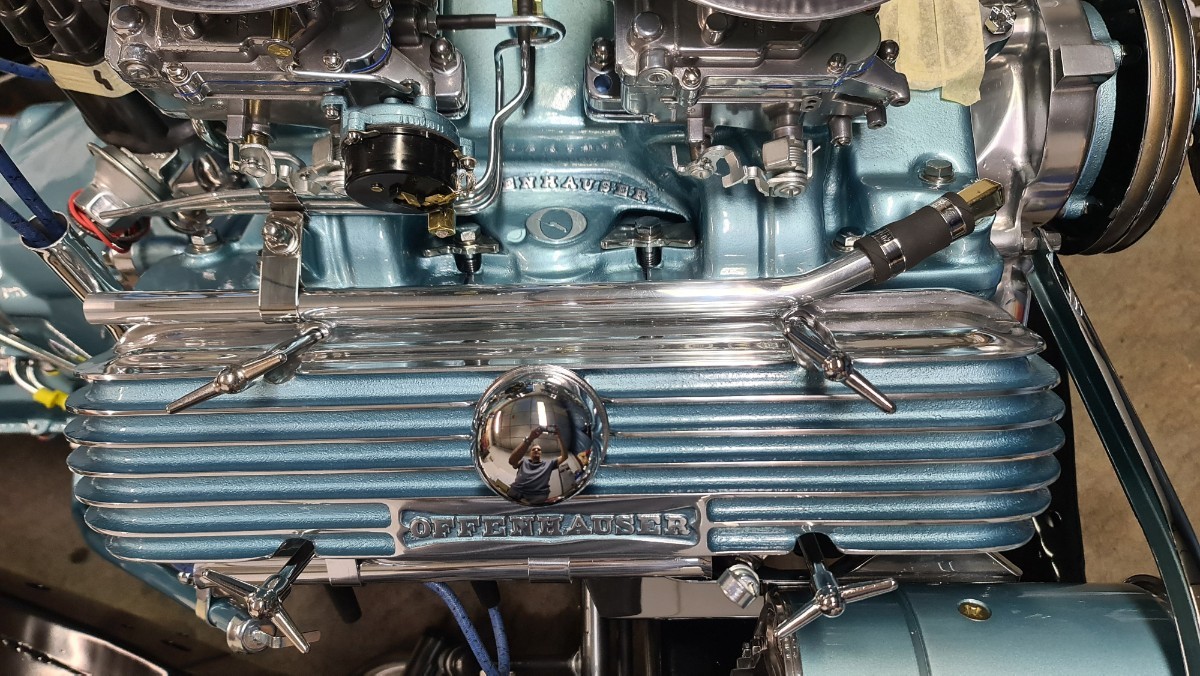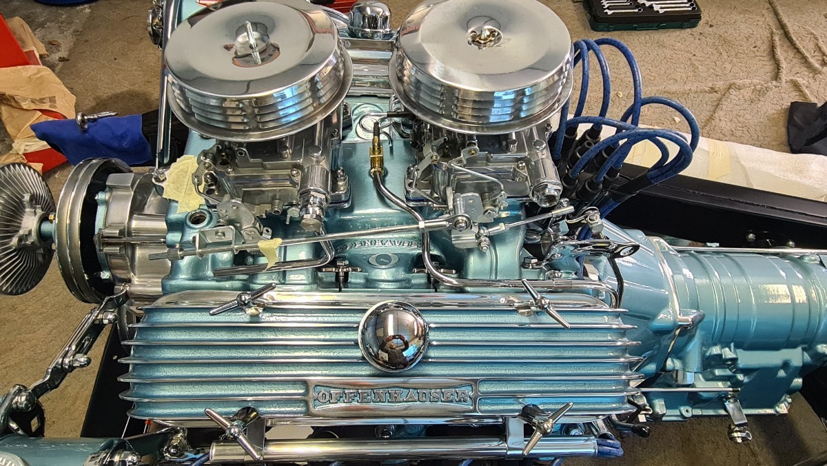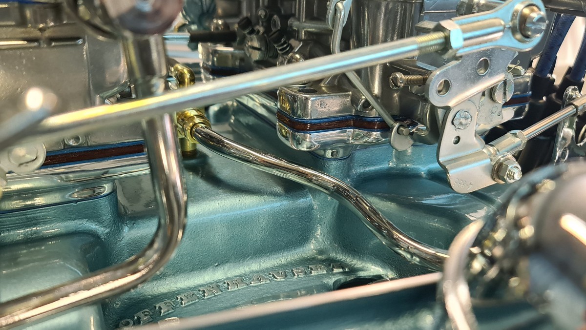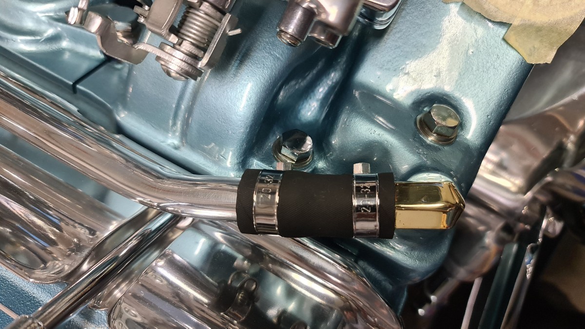 Du raccordement des échappements aux collecteurs Collecteurs qui n'étaient pas prévu pour le châssis en X. Mais cela avance quand même, les conduites et le faisceaux d'allumage sont terminés. Il reste juste un petit détail à résoudre esthétiquement (supprimer le collier Rislant) . Honnêtement je suis plutôt satisfait du résultat. Le reniflard d'huile et la valve pcv sont aussi définitivement en place. Non sans souci de place, c'est le tube sortant de la base du carburateur visible derrière l'allumeur. J'ai également refait le tube de dépression pour le mastervac .le premier n'était pas suffisamment gros et ne sortait pas au bon endroit. Ce tube se devait de passer plus bas est de ressortir plus proche de la culasse. Ce qui m'a permit de le fixer correctement a la culasse. Pour infos, dans la vie réelle de l'atelier, c'est pas loin de 4 versions qui ont été fabriqué pour arriver à faire un modèle qui tombe correctement. Puis il y avait aussi le tuyau caoutchouc de chauffage, qui à l'origine passait vulgairement sur le moteur. Donc la aussi une canalisation en aluminium à prit place pour gagner en esthétique et ne plus avoir de tuyau qui chevauche le moteur. Voici ce que cela donne une fois bridé. J'ai utilisé un raccord a 90° en laiton pour sortir le plus bas possible du collecteur. Cela est en place définitivement aussi. Et puis dans les dernières avancées, il y a aussi les filtres à air qui ont été trouvé. Se sont de belles copies de la version d'époque, en aluminium comme la version commercialisé par AC Delco pour le Super Duty ou les corvettes double quads.