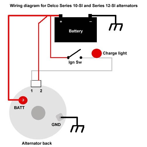 2. De ce que j’ai compris (pas sur la tête, hein ! ), ces alternateurs "SI" ne sont pas des alternateurs "classiques" (régulateur externe), mais à régulateur interne. Il n’y a pas de fil "excitation", comme dans le cas d’un alternateur classique à régulateur externe. Le fil, branché sur le "+" batterie, donne l’information de tension au régulateur intégré à l’alternateur (qui, lui même, excite l’alternateur). De ma compréhension toujours, ces alternateurs "SI" ont besoin de ces deux cábles. La résistance de l’idiot light joue un rôle dans le système : "There must be a load or draw on the voltage regulator to control its output. GM accomplishes this by wiring the No. 2 (field) wire into either an indicator lamp (see Diagram A) or, on some gauge-equipped cars, into the ammeter." https://www.hotrod.com/features/tech-tips-december-1983-982-1186-104-1 Ensuite, que le bornes soient alignées dans un sens ou un autre est sans importance*... si elles sont correctement identifiées. * a priori, les fiches prévues pour les anciens alternateurs (plug 300 ; plug 312) ne pourraient, de toute façon, pas se monter sur un alternateur "SI" (forme, taille des broches).
