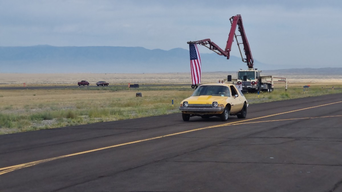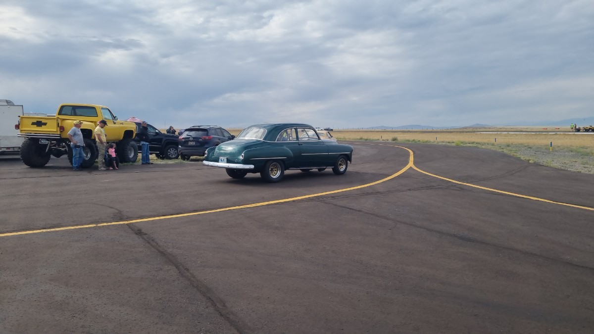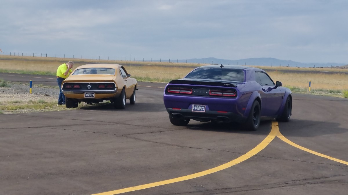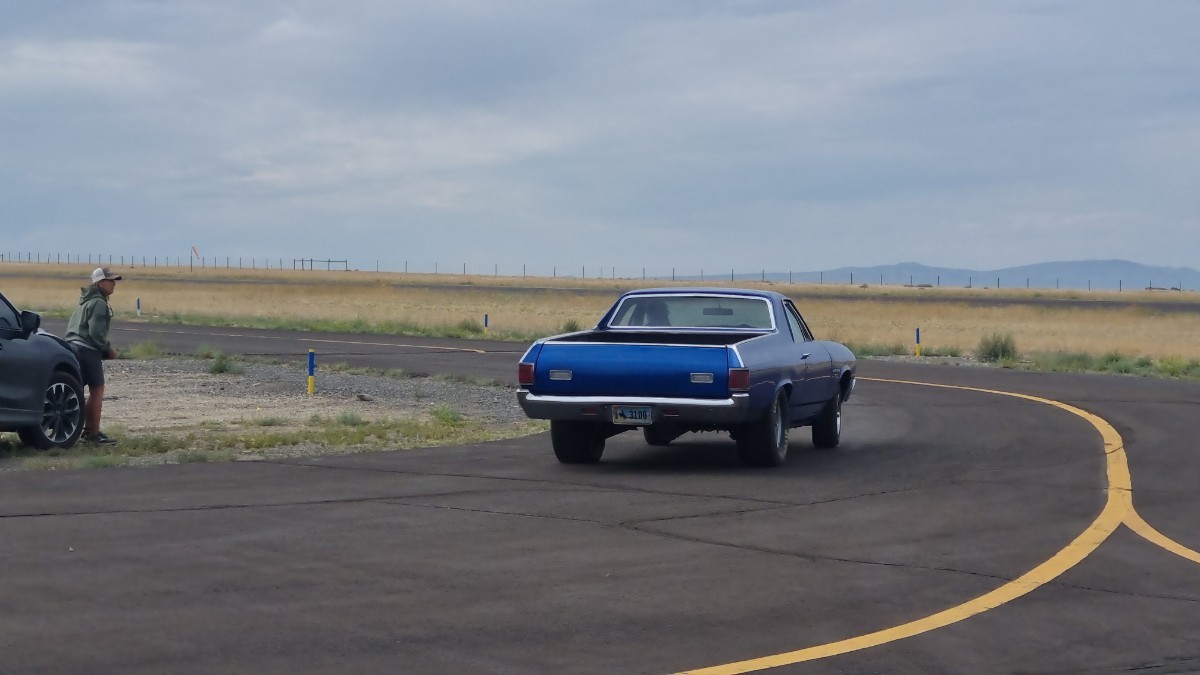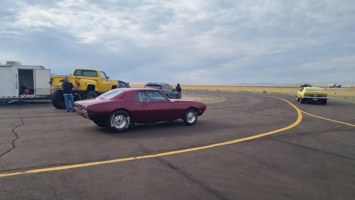 20250816_090057.mp4 Puis on entend une voiture sur la piste de l'aerodromme , on ce retourne et on voit une Mustang Mach 1 jaune qui ce prépare pour faire un run ! En vidéo ça ne rend pas du tout pareil , cette Mustang marché très fort ! 20250816_091541.mp4 20250816_091354.mp4 20250816_091728.mp4 Cette Mustang cache bien son jeux avec son aspect visuel de voiture d'origine , mais quand on voit les pneus de derrière on comprend qu'elle est méchamment préparer 20250816_091812.mp4 Puis qu'est ce qui arrive en orange ? La plymouth Duster que l'on a vu le matin a la station essence depuis notre hôtel ! . Elle aussi , bien préparer et piloter par une fille de 25 /30 ans ! Ils ce préparent pour le départ des courses de drag ! 20250816_091856.mp4 Puis on regarde les courses puis quelqu'un me tapote sur l’épaule . Je me retourne et c'étais une des femme que l'on avait vu le matin a coté de la Camaro avec le capot ouvert au bord de la route ! Elle était contente que l'on soit venu et elle nous dit de venir voir sa voiture juste derrière nous . Elle et son mari on une Camaro 68 préparer pour le drag ! 20250816_092106.mp4 Puis au loin la Duster ce prépare pour le départ de la Course 20250816_092302.mp4