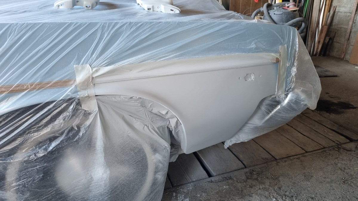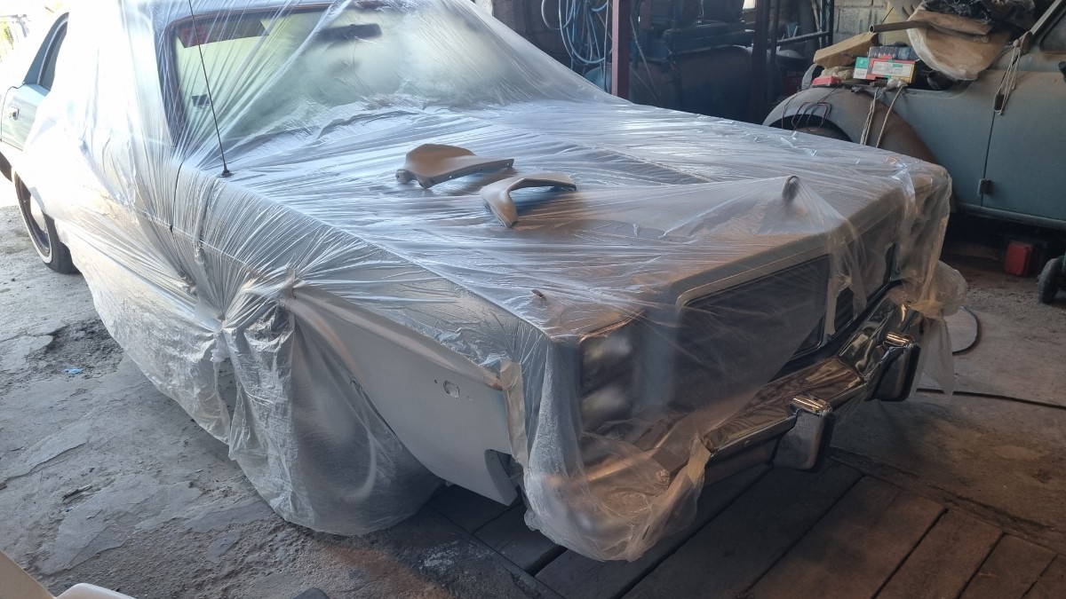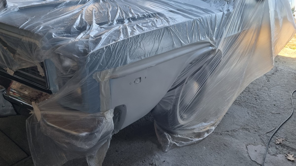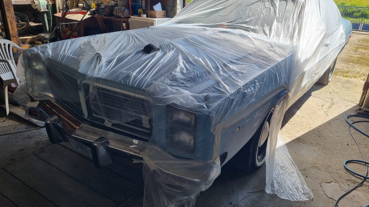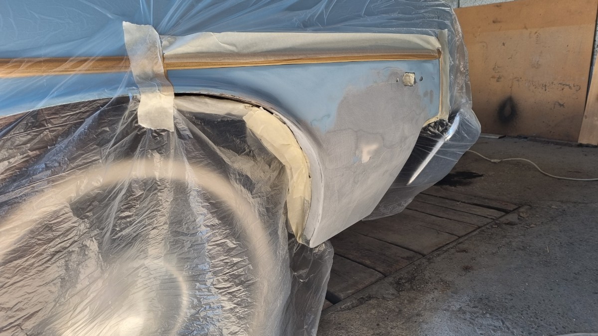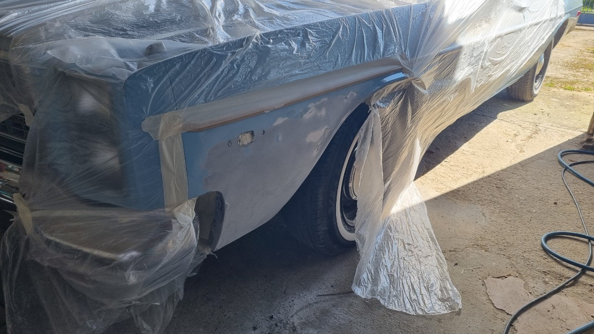 Bonsoir , voici quelques nouvelles de la Dodge . Mon voisin qui est carrossier / peintre c'est occupé de la suite des travaux , maintenant que les ailes sont prêtes . Normalement je devait lui emmener directement chez lui ( a 30 secondes de chez moi ) mais comme on était pas sur que la Dodge rentre dans son garage il a préférer venir faire les préparations avant peinture dans mon garage . Il venait y travailler dessus en journée et moi j'allais le voir en rentrant du travail . Protection pour les poussières du ponçage Mise en apprêt garnissant blanc Puis il a mis un coup de peinture noire pour servir de guide une fois poncé Puis ponçage