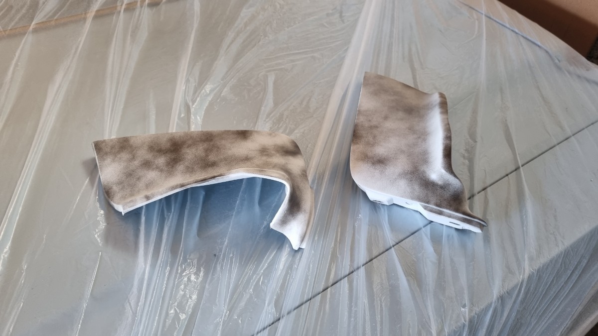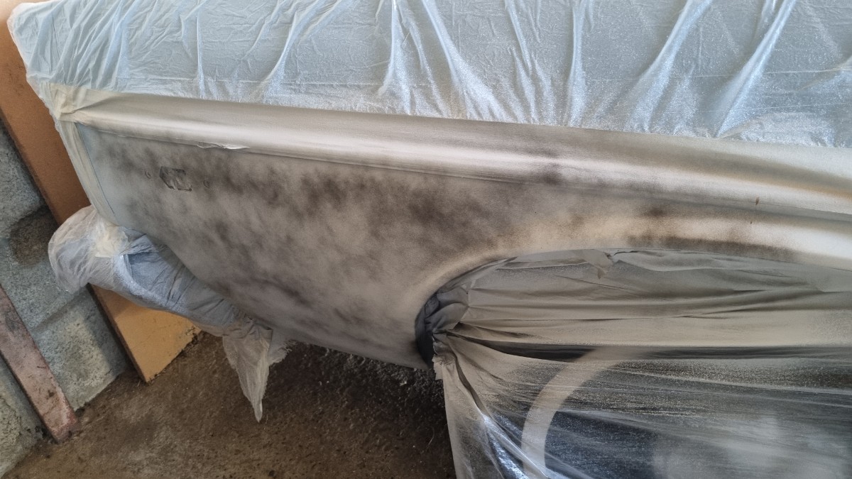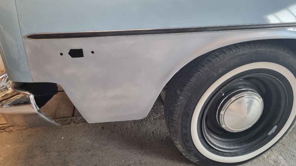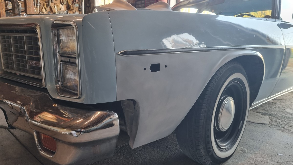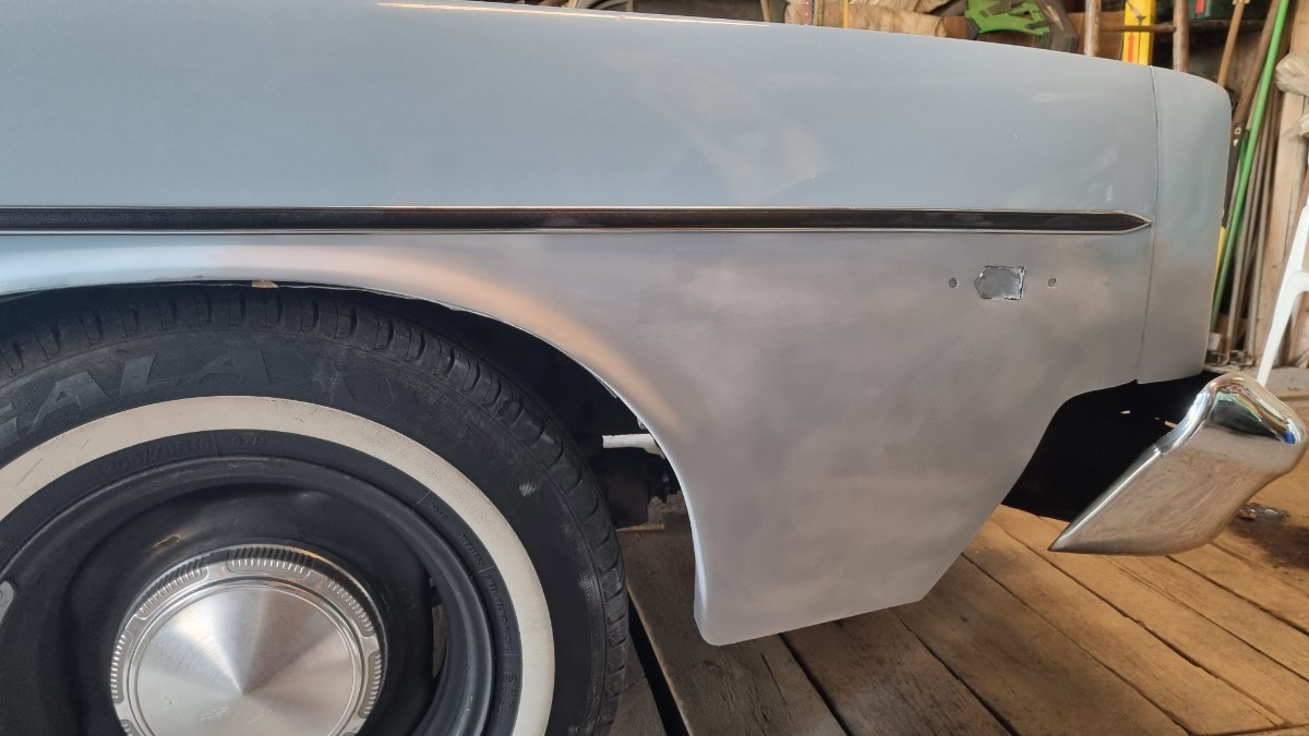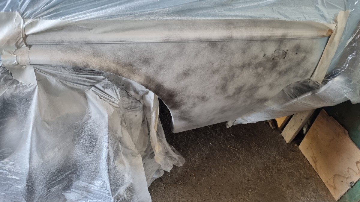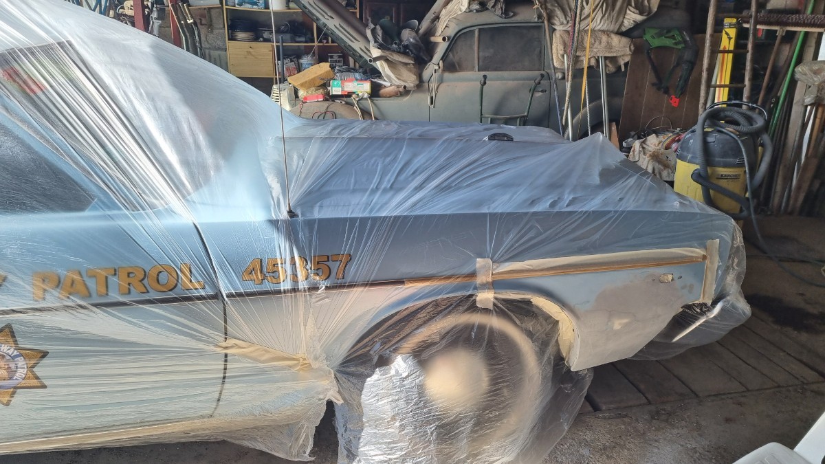 Bonsoir , voici quelques nouvelles de la Dodge . Mon voisin qui est carrossier / peintre c'est occupé de la suite des travaux , maintenant que les ailes sont prêtes . Normalement je devait lui emmener directement chez lui ( a 30 secondes de chez moi ) mais comme on était pas sur que la Dodge rentre dans son garage il a préférer venir faire les préparations avant peinture dans mon garage . Il venait y travailler dessus en journée et moi j'allais le voir en rentrant du travail . Protection pour les poussières du ponçage Mise en apprêt garnissant blanc Puis il a mis un coup de peinture noire pour servir de guide une fois poncé Puis ponçage