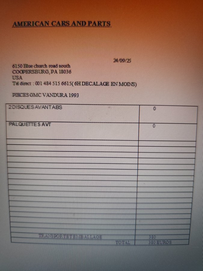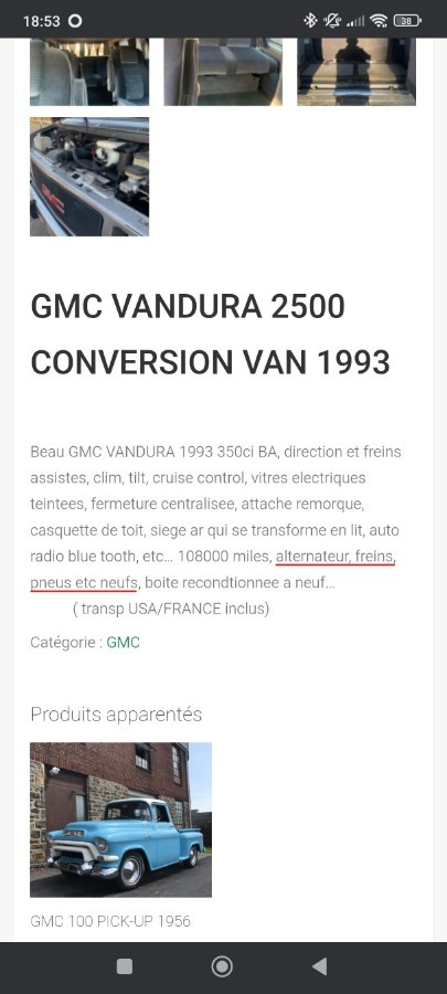 2. Bonjour à tous ! Certains le savent déjà via Fesse de Bouc, nous sommes nouvellement propriétaires d'un GMC Vandura 2500 de 1993. Cela a été fait un peu sur un coup de tête, le V8 me manquait de trop et faisant pas mal de sorties/meetings en pinup, avoir un endroit pour s'abriter se changer ou autre m'a fait envi d'un bon gros baisodrome comme j'aime les appeler. On avait déjà eu un van de chez vw mais celui ci était équipé caraving (frigo, plaque de cuisson, éviter etc), ici Jim (comme je l'appelle) est un bon gros van. Nous l'avons fait importé et c'est là que les soucis commencent... Pourquoi lui ? certains éléments étaient noté neuf ce qui avait fait pencher la balance pour ce pépère.... Nous avons donc traiter avec Gilles de American Cars and Parts qui nous l'a fait parvenir jusqu'au Havre. De la, nous avons entrepris un petit périple avec mon plus grand des fils (Maël 15 ans, vive les grèves ce jour là !) pendant que mon second était chez une copine chez une amie.. La route se passe plutôt bien, merci sanef pour ces merveilleux péages dont il faut se souvenir qu'il faille régler la note ^^ Nous sommes donc arrivés chez le prestaire Rogerville Entrepot Manutention ou nous avons fait sa connaissance une première fois. Petit tour du propriétaire, on regonfle les pneus et c'est reparti direction Brest. Quelques clichés qu'on m'avait parvenir (noté au passage que non pas de fuite mais c'est dû a son âge.... pourtant bocal de refroidissement fêlé et durite de direction en vrac qui fuyait ) Le départ pour le voyage en mer En attente de partir et après ce long voyage son arrivé à la maison Les enfants sont aux anges mais les parents eux sont un poil plus modérés.. car on sait que bon, ce n'est pas un véhicule neuf loin de là. Et la mauvaise surprise arrive. Si vous relisez bien l'annonce, j'ai souligné en rouge 'FREINS NEUFS'. A priori une inspection n'a visiblement pas été faite et il a du juste croire sur parole le vendeur car voila les fameux FREINS NEUFS : (sans compter un ptit coup de karsher n'aurai pas été du luxe...) J'en averti Gilles, je lui laisse le temps car bon, je ne suis pas méchantes et, alors que le problème vient pas de moi mais de son inspection mauvaise, la seule solution apportés c'est de m'expédier a mes frais (380€ l'expédition XD) et prendre a sa charge les pièces... (je laisse passer le 'palquettes' et une facture loin d'être pro, comme l'inspection finalement... J'avais prévenu que j'attendais un peu de sa réactivité avant de faire x posts sur x supports.. ne voyant pas les choses avancer je me décide aujourd'hui à faire la présentation de Jim tout de même, malgré l'incompétence de Gilles a ne pas savoir inspecter correctement un véhicule. Admettre son erreur de mauvaise inspection et envoyer des freins neufs avec les port à sa charge aurait été plus intelligent et correct de sa part et l'histoire aurait été classé mais non. J'ai pourtant été gentille d'avertir, de prévenir, mais un moment faut juste pas me prendre pour une 'mot censuré ^^' . Bien sure certains ont eu vent et j'ai eu le droit mais pourquoi tu as traité avec lui etc etc, comme j'ai dit, cela c'est fait sur un coup de tête et j'avais, auparavant déjà traiter avec lui pour des commandes de pièces ou parfois ca passait bien et parfois pas mais à l'époque c'était le seul qu'on connaissait mais ce qui est sûre c'est que je ne le recommande pas... Voila pour la ptite histoire ! (maintenant je vais me retaper un peu la même chose sur mon fesse de bouk mais priorités à la dreams cars ❤️ ) A l'heure d'aujourd'hui je n'ai plus de nouvelles mais Jim a eu le droit a un bon décrassage au bissel rien que pour l'intérieur et un peu de sent bon Je l'ai conduit une première fois et la taille m'a pas posé problème, il a casi la même taille que ma mondeo hybrid (ouais je suis mis écolo mis anti greta XD) et j'ai plutôt apprécié. C'est tout pour aujourd'hui, bisous !
