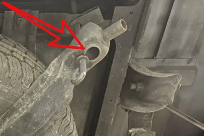 Cette histoire de roue de secours a pourri ma journée Resultat des recherches : pas besoin du trou "imprudent" pour descendre la roue. Manuel du conducteur : Photo d’un F-150 de 1992, trouvée au hasard du net : La roue de secours est tenue uniquement par l’anneau au bout de la flèche. Le trou "imprudent" est probablement du à un pare-choc after-market compatible avec plusieurs modèles.