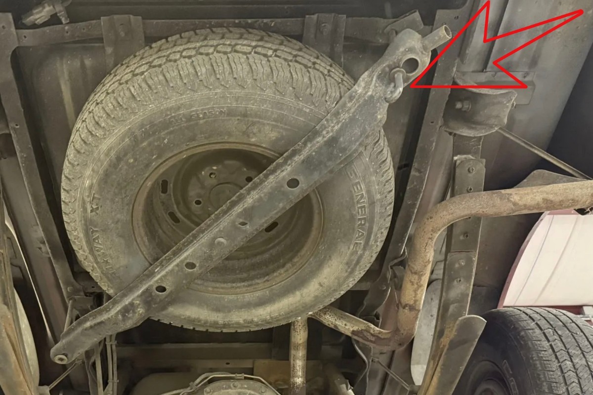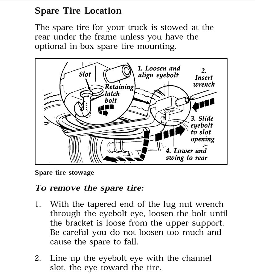 Cette histoire de roue de secours a pourri ma journée Resultat des recherches : pas besoin du trou "imprudent" pour descendre la roue. Manuel du conducteur : Photo d’un F-150 de 1992, trouvée au hasard du net : La roue de secours est tenue uniquement par l’anneau au bout de la flèche. Le trou "imprudent" est probablement du à un pare-choc after-market compatible avec plusieurs modèles.