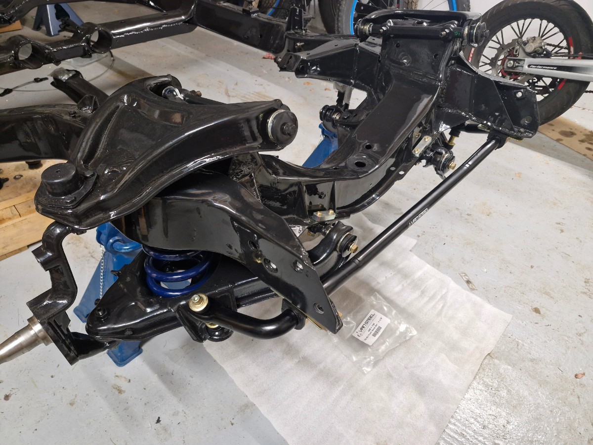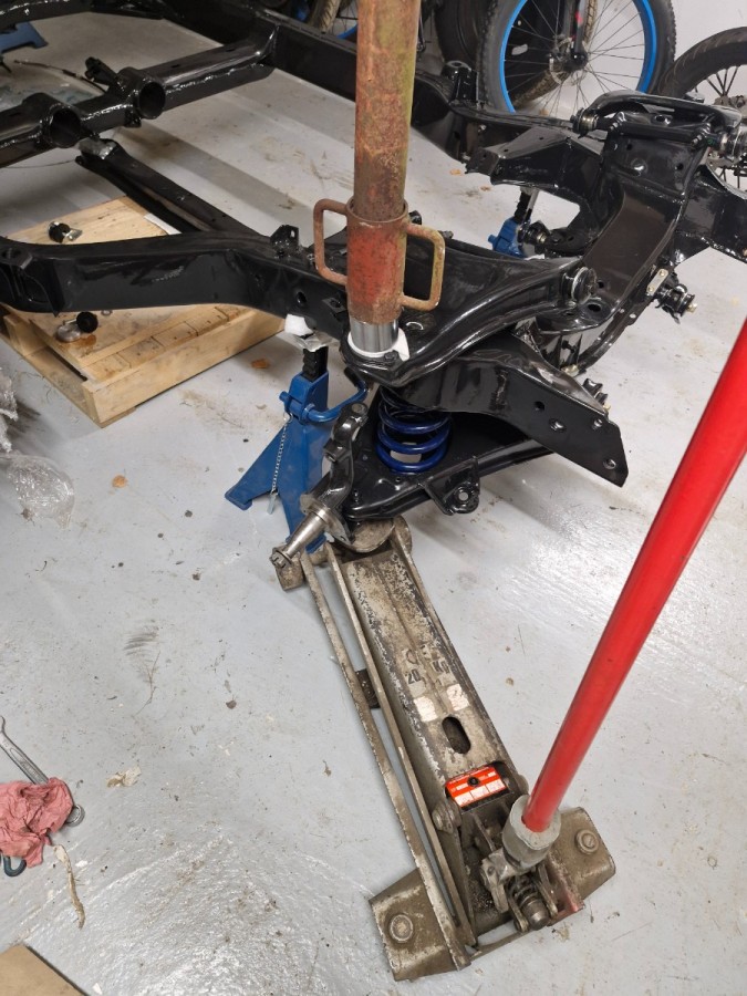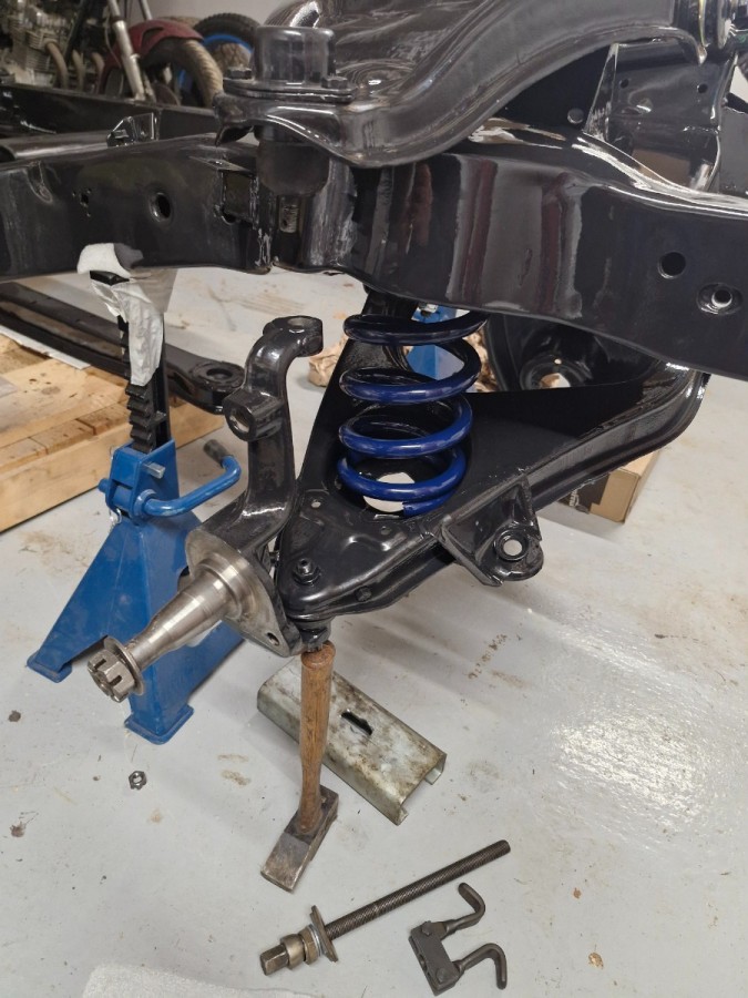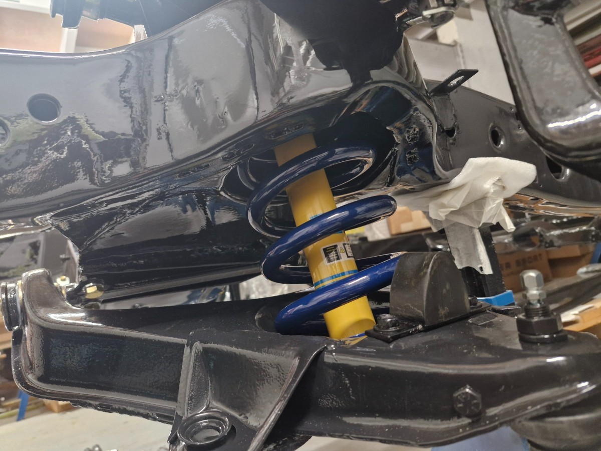 Vérification des cales de réglage de la géométrie: Comme la Corvette va recevoir une direction assistée, je prévois deux cales (un peu au pif..) à positionner à l'arrière du triangle afin de donner de la chasse. Contrairement au calage d'origine (épais pour obtenir un carrossage négatif), avec des ressorts plus courts à venir, je ne met rien d'autre pour l'instant. J'ai trouvé cette cote à vérifier sur le châssis. 67 cm entre les fixations avant sup de triangle. C'est conforme. Montage des triangles et des ressorts. Les ressorts d'origines sont remplacés par des progressifs Ride Tech. Moins un pouce théorique, à voir.. voiture finie. J'ai hésité à monter le ressort avec ce montage, cornière en dessous le triangle et rapprocher les spires depuis l'intérieur. Mais bon, la peinture aurait morflée.. Plan B. Un etai en appui au plafond contre les solives et un cric en dessous appuyé avec une douille sur la rotule, check ça a marché ! Les vis de serrage des bagues de triangles ne seront serrées qu'une fois la caisse et le moteur remontés histoire d'éviter les contraintes. Présentation de la barre stabe de 1- 1/8 eme. La barre stabilisatrice est déposée et ne sera remontée qu'à la fin. Montage des amortisseurs Bilsten B8. ça devrait coller avec le combo ressorts/barre stab/ et combo suspensions arrière.