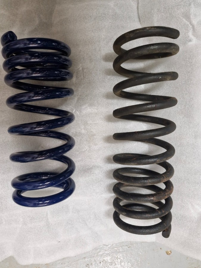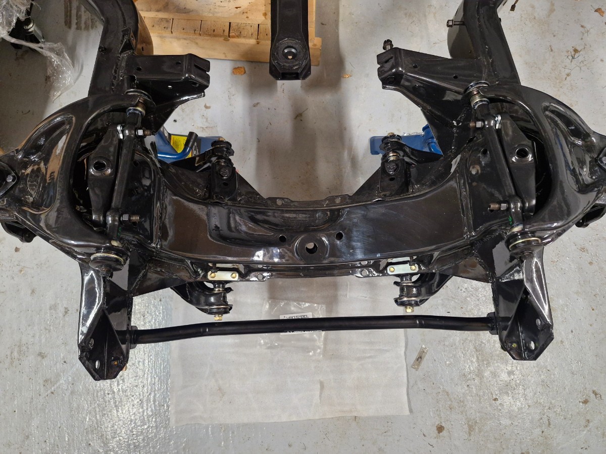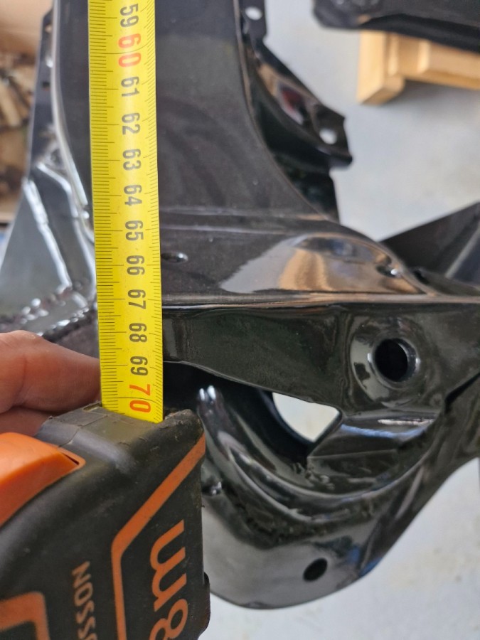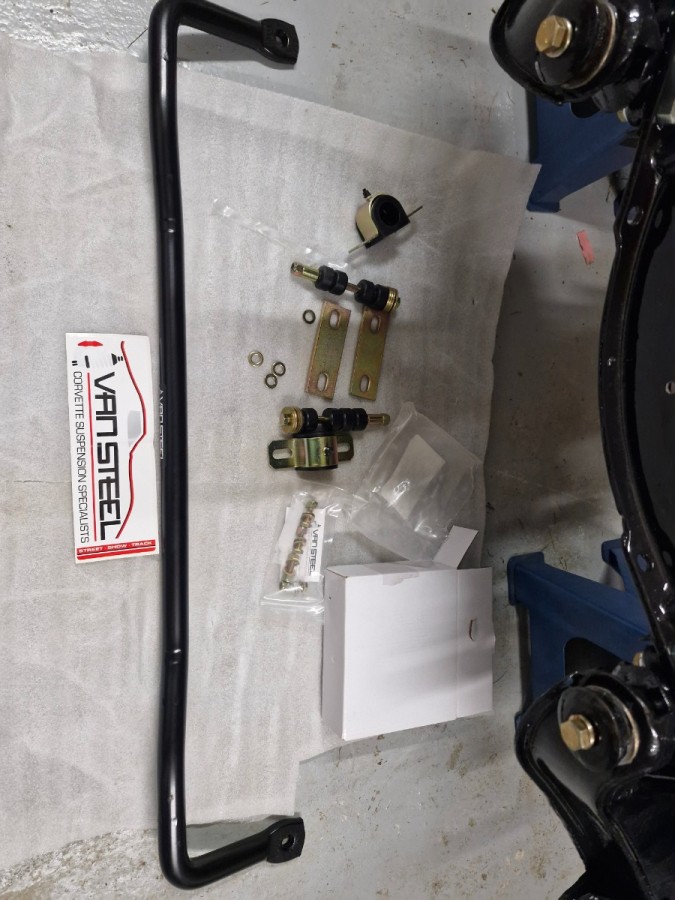 Vérification des cales de réglage de la géométrie: Comme la Corvette va recevoir une direction assistée, je prévois deux cales (un peu au pif..) à positionner à l'arrière du triangle afin de donner de la chasse. Contrairement au calage d'origine (épais pour obtenir un carrossage négatif), avec des ressorts plus courts à venir, je ne met rien d'autre pour l'instant. J'ai trouvé cette cote à vérifier sur le châssis. 67 cm entre les fixations avant sup de triangle. C'est conforme. Montage des triangles et des ressorts. Les ressorts d'origines sont remplacés par des progressifs Ride Tech. Moins un pouce théorique, à voir.. voiture finie. J'ai hésité à monter le ressort avec ce montage, cornière en dessous le triangle et rapprocher les spires depuis l'intérieur. Mais bon, la peinture aurait morflée.. Plan B. Un etai en appui au plafond contre les solives et un cric en dessous appuyé avec une douille sur la rotule, check ça a marché ! Les vis de serrage des bagues de triangles ne seront serrées qu'une fois la caisse et le moteur remontés histoire d'éviter les contraintes. Présentation de la barre stabe de 1- 1/8 eme. La barre stabilisatrice est déposée et ne sera remontée qu'à la fin. Montage des amortisseurs Bilsten B8. ça devrait coller avec le combo ressorts/barre stab/ et combo suspensions arrière.