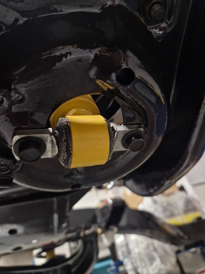 Des news.. C'est au tour du train avant de se refaire une santé. Montage des rotules pour les triangles Les bagues... Pour le triangle inférieur, avec l'A-arm qui est monté dessus, je trouve 3/10 -ème de jeu avec des bagues Moog neuves. 3/10 -ème donne près de 5mm de pivotement du bras à son extrémité coté roue lors de contraintes. A cela se rajoute au fil du temps et des à-coups, l'ovalisation de la bague inférieur lorsque le caoutchouc ne joue plus son rôle. Le train avant devient alors baladeur, à géométrie variable.. Trois possibilités de montage: -Bagues Moog. -Bagues Polyuréthane. -Bras neuf avec bagues spécifiques Corvette Central. Il n'y a plus que 1/10eme de jeu puisque que les bagues sur mesure sont plus serrées. Je me décide à garder les bras d'origine et d'y rajouter un cliquant inox d'1/10eme pour réduire à un petit 10eme le jeu.. Les bagues polyuréthane permettent d'avoir une rotation autour de la bague centrale contrairement aux classiques en caoutchouc, c'est un bon point pour avoir un pivotement assez libre. Place au montage: Summit vends des pots pour compléter ce qui est fournis par les vendeur de kit poly. Une fois peint: Triangle supérieur.