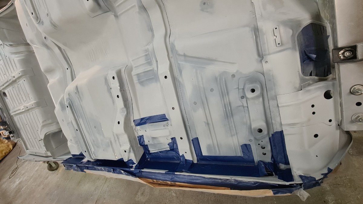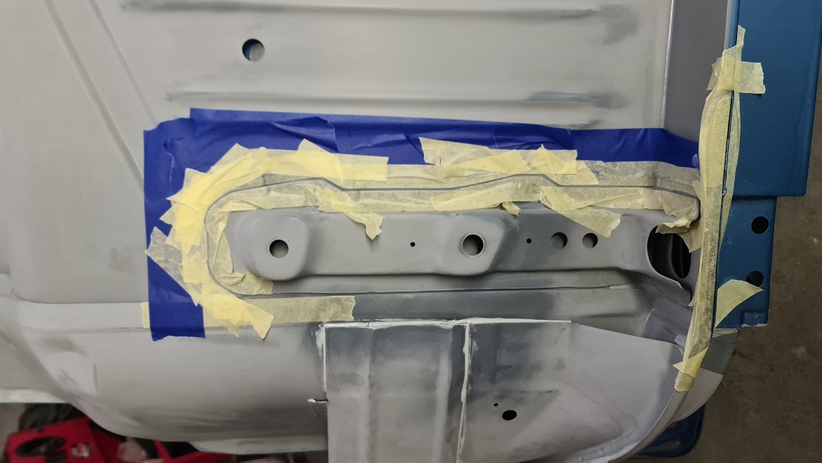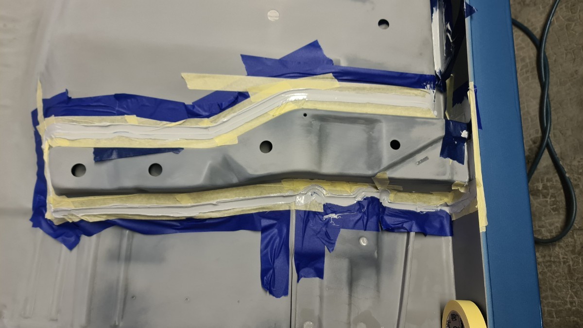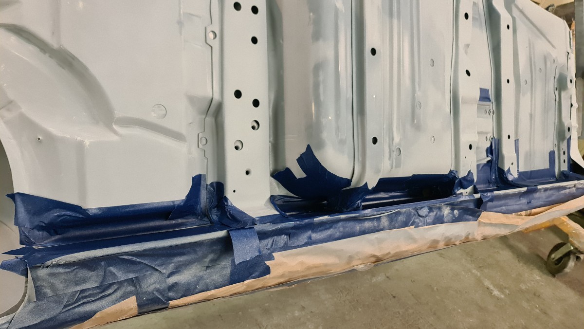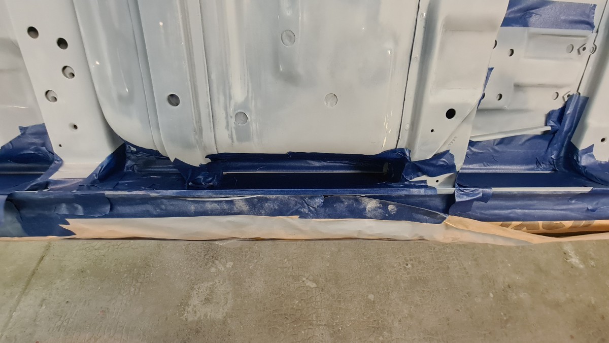 J'ai attaqué les joints de carrosserie !!! Comme vous le savez, je ne sais pas les faire sans utiliser des tonnes de papiers et des centaines de gants Donc je protège, les zones qui ne doivent pas être contaminer. Ici le long du passage de roue le joint se doit d'être large. Parfois le joint large a une double fonctions, effet d'insonorisant et étanchéité. C'est interminable, cela doit faire rire les carrossiers. Après le masquage, c'est l'application du joint. Ils reste les trois grandes traverses, environs 7 à 8 mètres joint ...