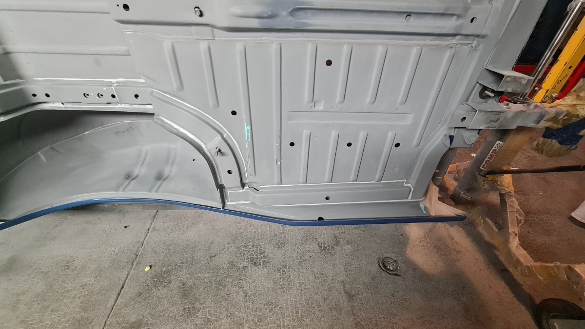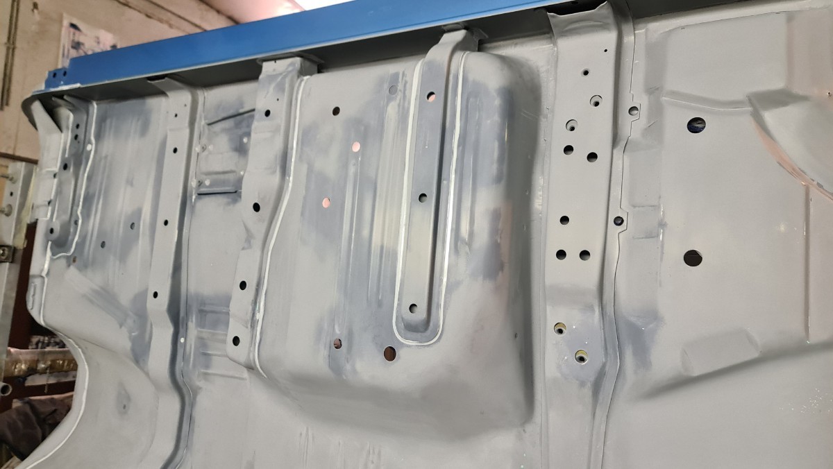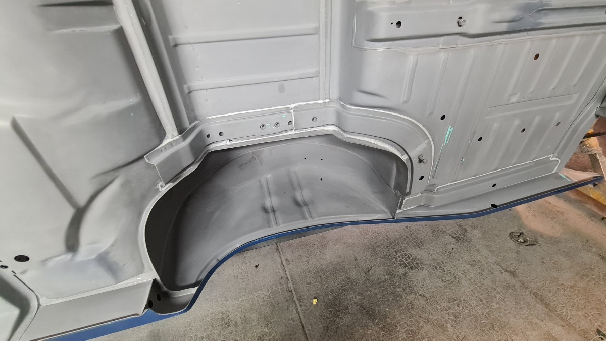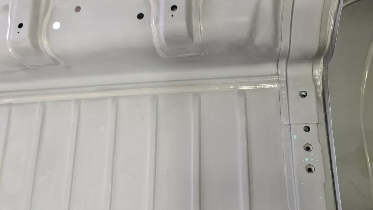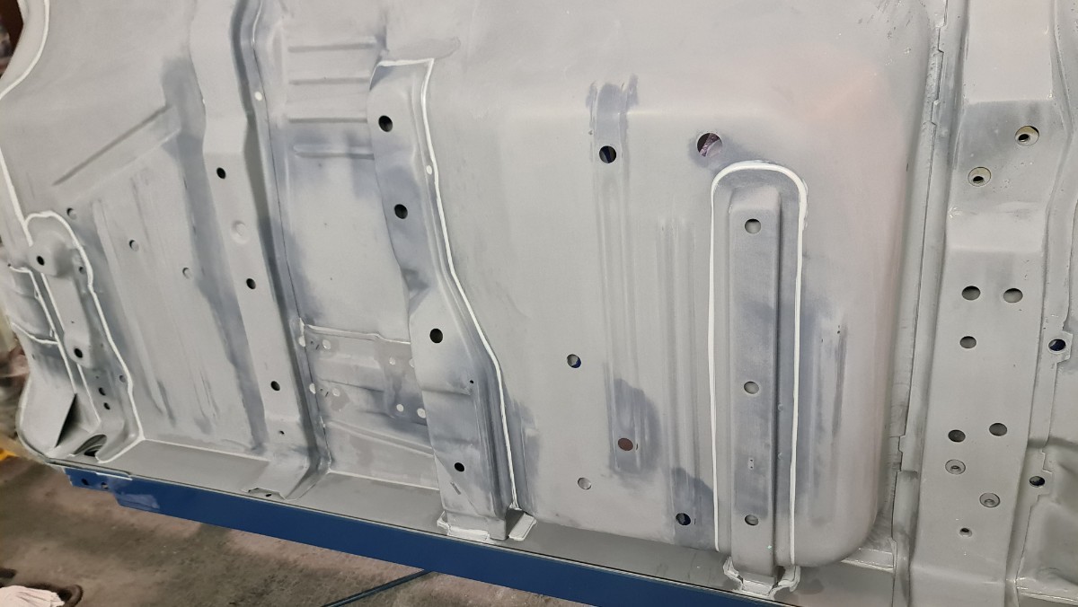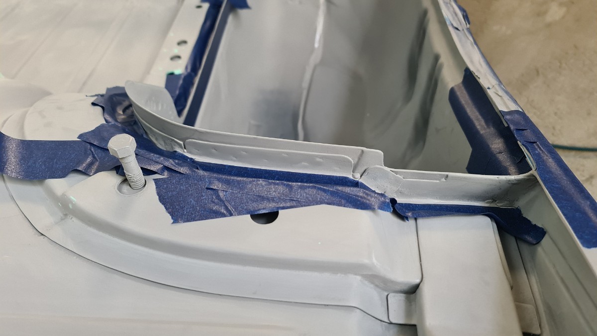 J'ai attaqué les joints de carrosserie !!! Comme vous le savez, je ne sais pas les faire sans utiliser des tonnes de papiers et des centaines de gants Donc je protège, les zones qui ne doivent pas être contaminer. Ici le long du passage de roue le joint se doit d'être large. Parfois le joint large a une double fonctions, effet d'insonorisant et étanchéité. C'est interminable, cela doit faire rire les carrossiers. Après le masquage, c'est l'application du joint. Ils reste les trois grandes traverses, environs 7 à 8 mètres joint ...