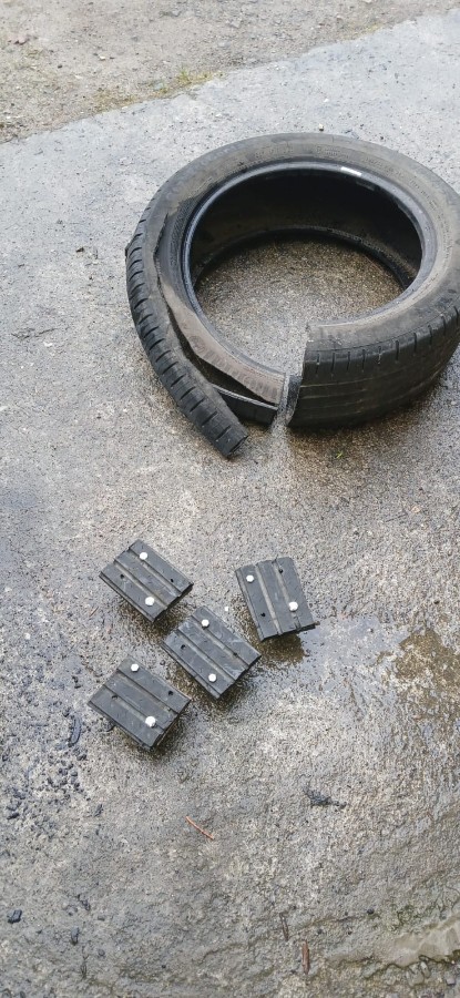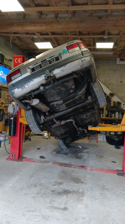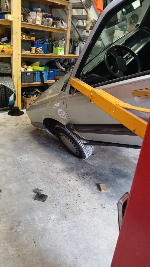 Aujourd'hui, contrôle de routine sur ma 21 préférée, avec vérification du train avant ou j'entends parfois un claquement, et un coup de peinture sous les soubassements. Je monte la voiture sur le pont, comme d'habitude, comme j'ai fait les 100 dernières fois. J'inspecte vite fait le dessous, tout va bien, je la redescends à mi course pour pouvoir peindre les soubassements en prévision de l'hiver. Je vais pour touiller mon pot de peinture, et j'entends un énorme bruit derrière moi, comme si le freaking titanic venait de rentrer dans mon atelier. Je me retourne et je vois ça: Je vous jure que ça impressione, c'est pas souvent qu'on peut admirer un tel carnage. L'explication? Le verrouillage à crémaillière, qui s'enclenche automatiquement sur chaque bras, ne s'est pas engagé sur le bras avant gauche. Pourquoi? Je ne sais pas. En temps normal, cela n'aurait pas posé de soucis, mais le caoutchouc du bras avant droit, lui, était bien fatigué. Il s'est coupé net par le milieu, et n'a pas retenu le bras avant gauche, qui s'est écarté du bas de caisse, et à tout emporté. Deux circonstances navrantes et parfaitement évitables si j'avais vérifié le verrouillage du bras (qui jusqu'ici ne m'a jamais posé de soucis) et si j'avais remplacé les patins. J'ai donc commencé par là, pour rattraper ma triste journée: Taillés dans du pneu et boulonnés, ils ne bougeront plus. Ensuite on reteste... il faut tout de suite remonter à cheval Et après, on répare les conneries de la journée. Voilà, comme quoi, ça n'arrive pas qu'aux autres. Belle leçon d'humilité me concernant, car à 30 seconde près, j'étais dessous, et DC pouvait se trouver un autre secrétaire...