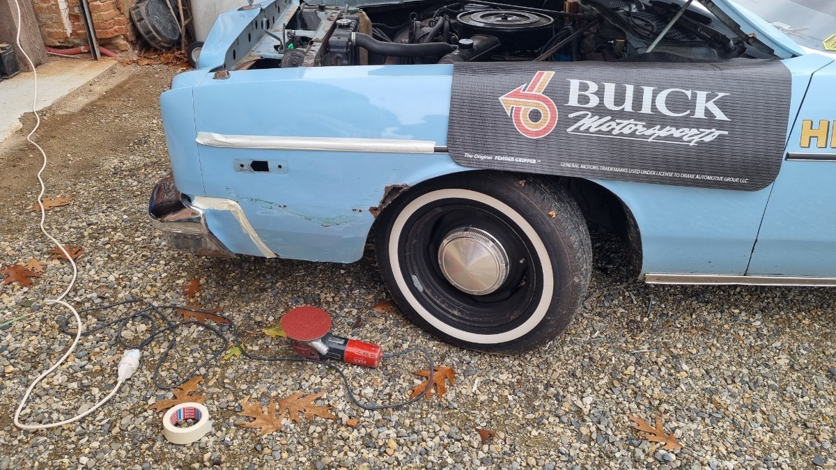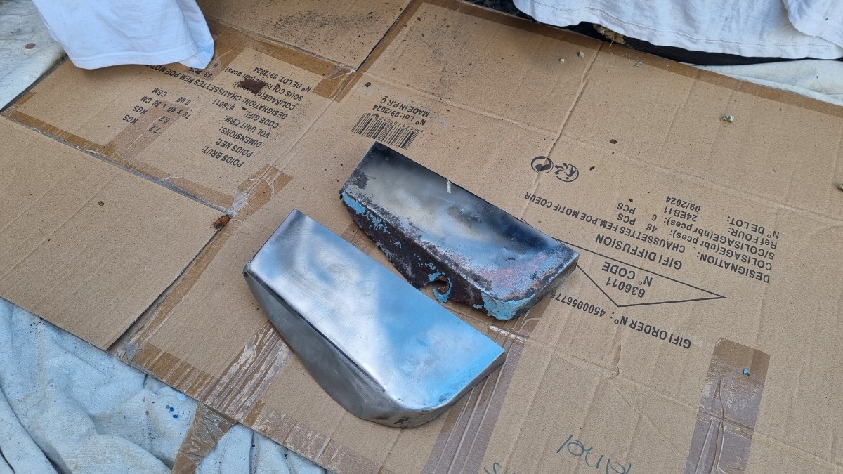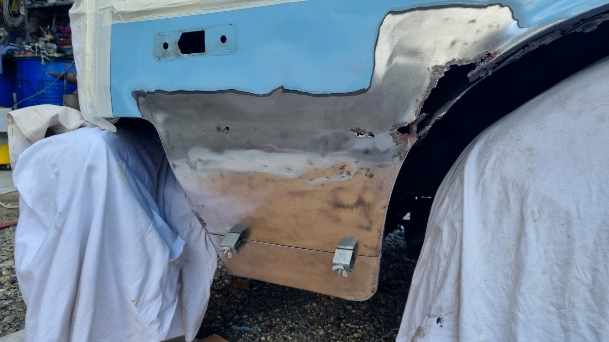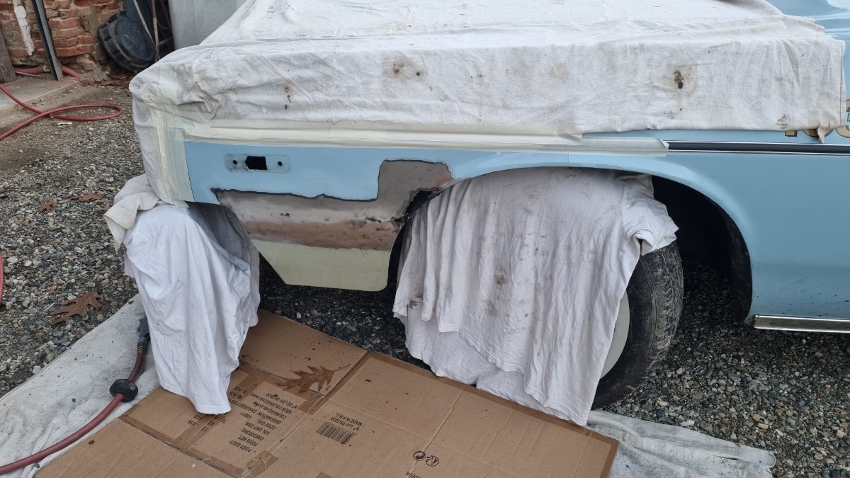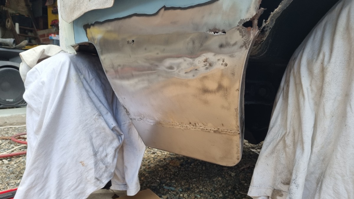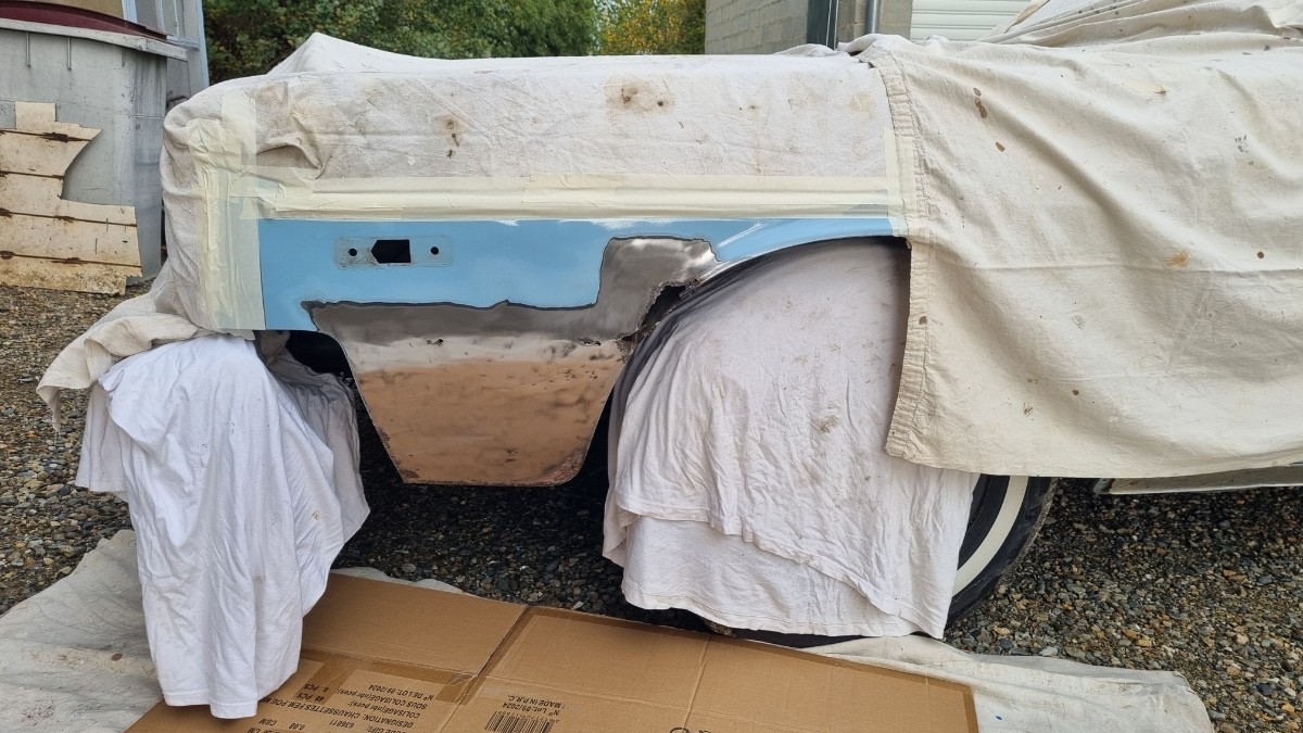 Puis j'en profite pour refaire le bas de l'aile . Normalement je voulais faire ça quand la Buick serait fini , comme ça j'avais la place pour y mettre la Dodge et démonté les ailes avant . Sauf que ça a éter précipité et du coup je fait ça avec l'aile en place :/ Je fait un gabarie en carton Que je reproduit sur de la tôle , pour l'instant ça ressemble a pas grand chose Puis je le plie pour refaire le bas de l'aile Découpe du bas de l'aile Puis mise en place du nouveau Pointage Et soudure Puis je met un coup d’apprêt phosphatant juste pour que ça ne prenne pas l'humidité La nuit tombe , je continuerai donc le lendemain Je posterai la suite demain surement
