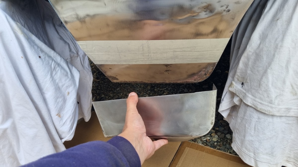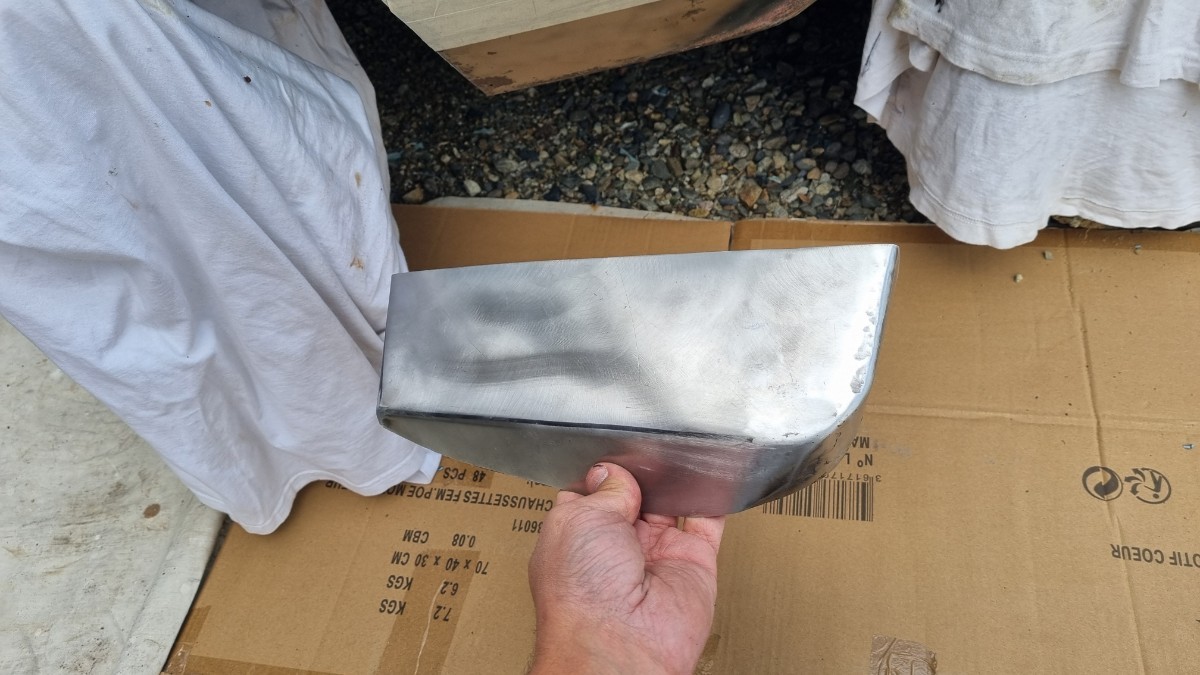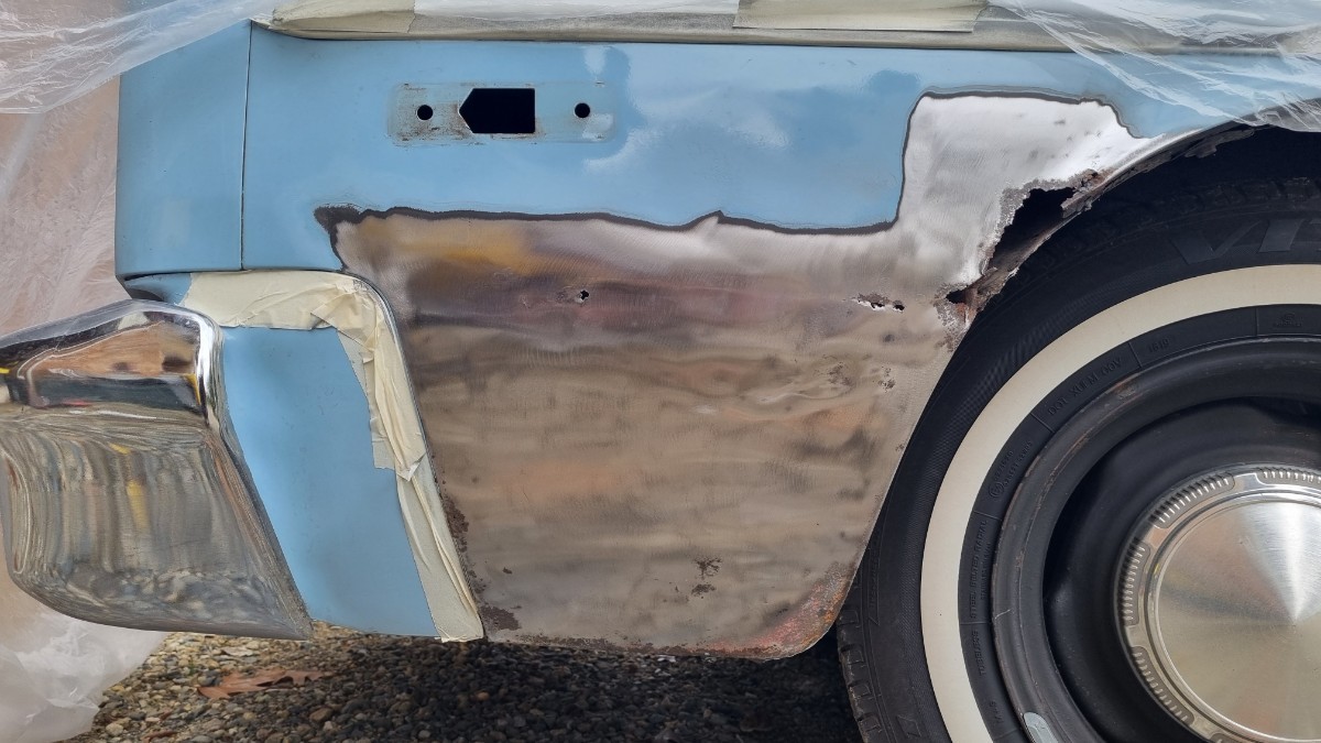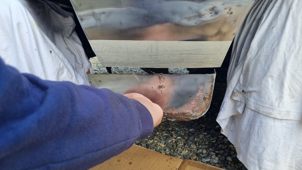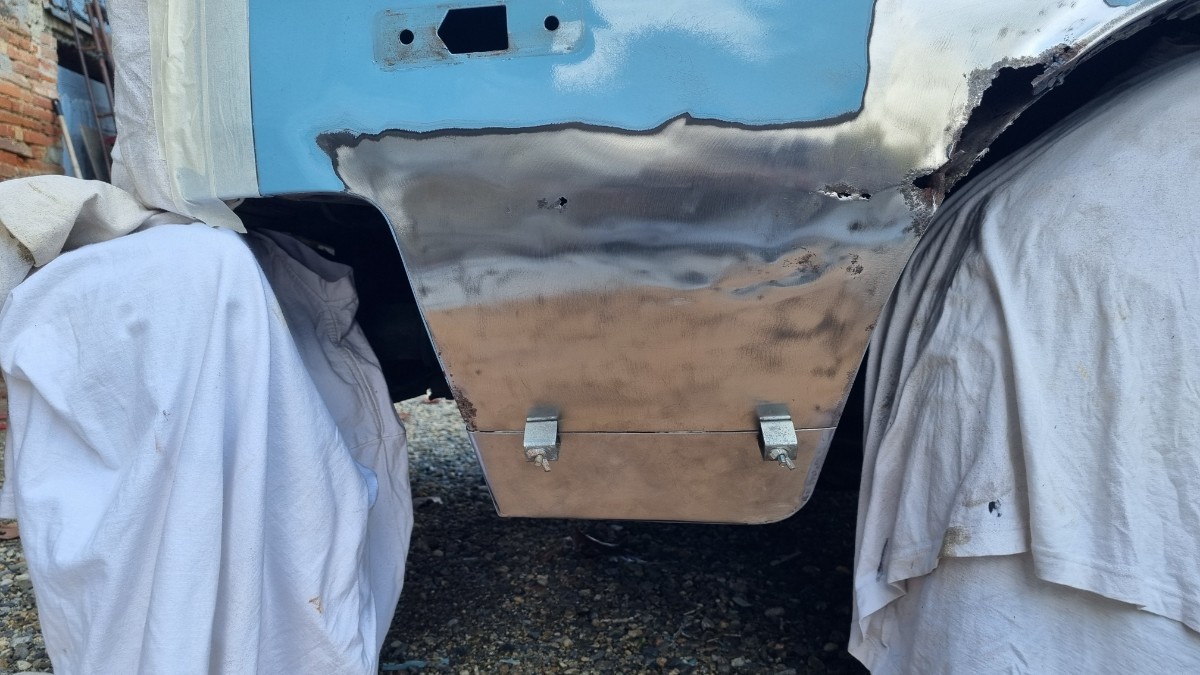 Puis j'en profite pour refaire le bas de l'aile . Normalement je voulais faire ça quand la Buick serait fini , comme ça j'avais la place pour y mettre la Dodge et démonté les ailes avant . Sauf que ça a éter précipité et du coup je fait ça avec l'aile en place :/ Je fait un gabarie en carton Que je reproduit sur de la tôle , pour l'instant ça ressemble a pas grand chose Puis je le plie pour refaire le bas de l'aile Découpe du bas de l'aile Puis mise en place du nouveau Pointage Et soudure Puis je met un coup d’apprêt phosphatant juste pour que ça ne prenne pas l'humidité La nuit tombe , je continuerai donc le lendemain Je posterai la suite demain surement