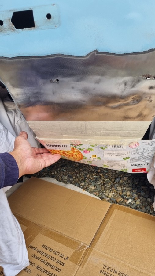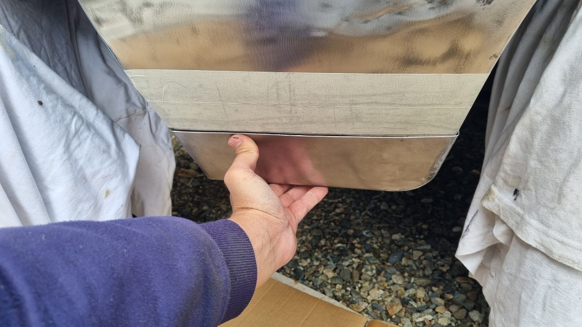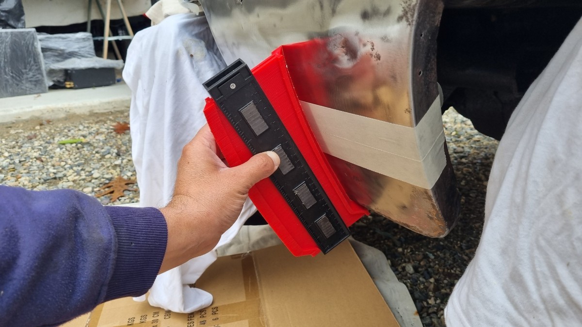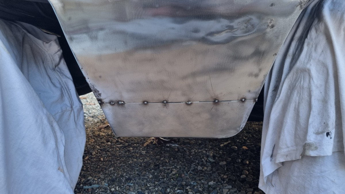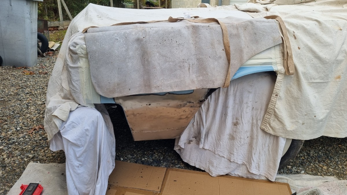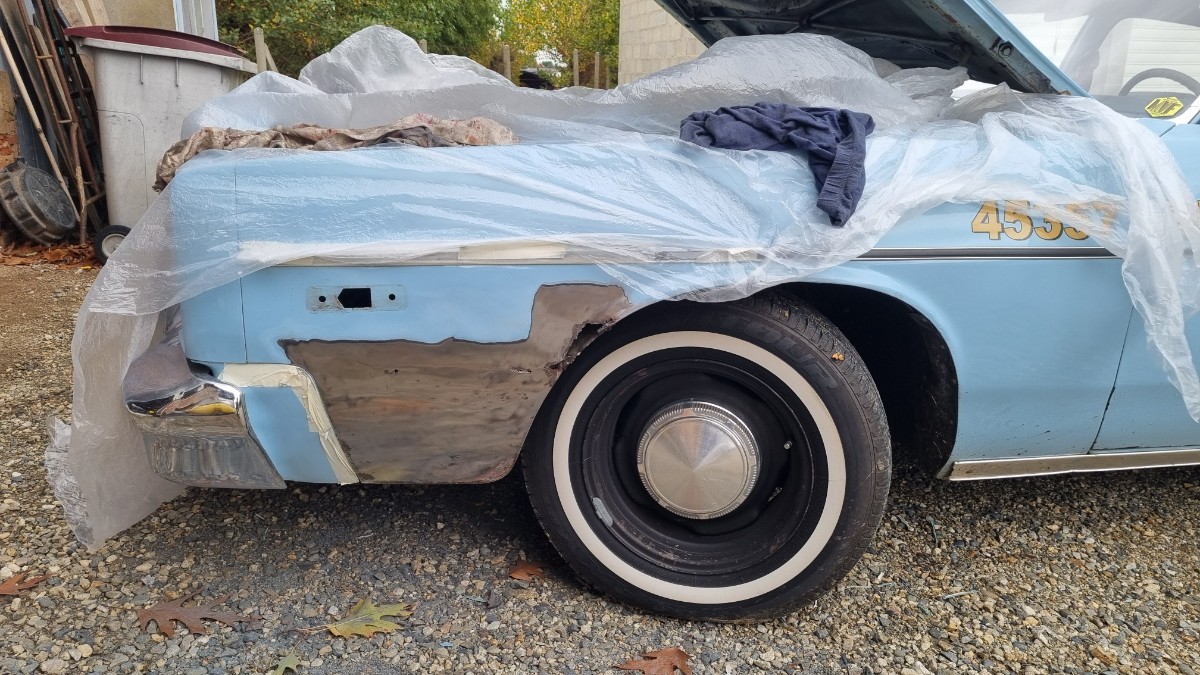 Puis j'en profite pour refaire le bas de l'aile . Normalement je voulais faire ça quand la Buick serait fini , comme ça j'avais la place pour y mettre la Dodge et démonté les ailes avant . Sauf que ça a éter précipité et du coup je fait ça avec l'aile en place :/ Je fait un gabarie en carton Que je reproduit sur de la tôle , pour l'instant ça ressemble a pas grand chose Puis je le plie pour refaire le bas de l'aile Découpe du bas de l'aile Puis mise en place du nouveau Pointage Et soudure Puis je met un coup d’apprêt phosphatant juste pour que ça ne prenne pas l'humidité La nuit tombe , je continuerai donc le lendemain Je posterai la suite demain surement