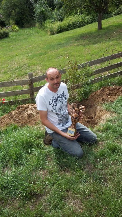 Bon, et bien voilà, j'ai reçu le Cudador 2017, pour présence assidue sur le forum. Jusque là tout va bien ça fait plaisir, mais pourquoi moi? Je ne suis pas le plus calé en mécanique ou truc compliqué, je me débrouille mais sans plus.....j'ai posté le N° 1000 dans le jeu de la suite....oui...cela doit être ça!...Mais non....je suis remercié pour mon assiduité à entretenir un post ou sont mêlée jolies carrosseries de pays de l'oncle Sam et autres créatures de la tentation et diablesses tout aussi appétissantes.....que je ne suis pas le seul a apprécier d'ailleurs: Une rare T-Bird néo retro.....intéressant non, Bref....je me devais de donner des nouvelles de ce Cudador, qui au delà du symbole et de l'honneur qu'il représente est dur à caser dans la déco de la maison. J'ai du composer avec Mme Zitoune et les enfants......verdict....."Dégage moi cet horreur (J'avais compris honneur!) de la table de la salle à manger, du bureau, de la salle de bain, du meuble télé, de la cuisine, de l'entrée, de la vitrine, .....". J'ai pas osé la table de nuit! Bilan, je le cache bien, où alors je prends ma tente décathlon fresh and black, un aller simple pour Vallons en Sully et j'attends 11 mois pour le refiler au prochain heureux homme (ou femme) qui le recevra en 2018. Mais j'aime bien ma famille et sous la pression (4 bières) j'ai du faire un choix. Je n'ai trouvé que la solution du jardin, loin, au fond. Mais je sais où c'est......enfin je crois.....mais si, je le retrouverai: Mais qu'est ce que j'ai fait..... R.I.P.