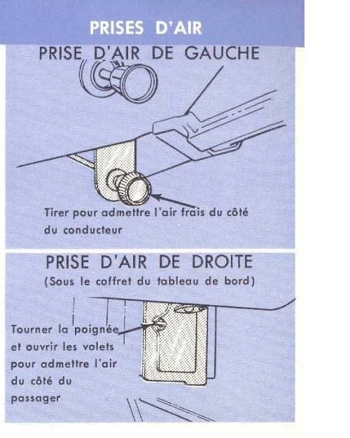 17. Les cheminées de chauffage permettent de faire entrer de l'air dans le système de chauffage tout en évitant que l'eau de pluie puisse entrer dans l'habitacle. Ce système n'est absolument pas prévu pour évacuer l'air chaud du compartiment moteur. Pour avoir un air plus frais dans l'habitacle, il existe deux trappes de chaque coté du tableau de bord qui permettent de faire entrer directement l'air pris au niveau de la grille à la base du pare-brise vers les pieds du conducteur et du passager. Les commandes sont différentes pour chaque coté : pour le conducteur c'est une tirette qui ressemble à la commande d'un starter manuel et pour le passager c'est une simple porte qu'on ouvre. Un petit dessin valant mieux qu'un long discourt....