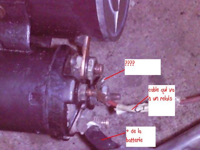 Sur les Ford de ces années là, en principe tu as un gros fil rouge qui part de la batterie qui arrive sur un relais qui sert pour le démarreur, de ce meme plot tu as un autre fil (sur ma stang il est jaune) qui repart vers l'habitacle. De l'autre coté du relais (sur le plot opposé) tu doit retrouver uniquement un autre gros fil qui va directement au démarreur. Et pour finir au milieu du relais du doit retrouver le fil d'excitation qui alimente le relais quand tu met le neiman sur démarrage, c'est un petit fil avec une cosse ronde femelle (qui s'emboite juste sur la cosse)