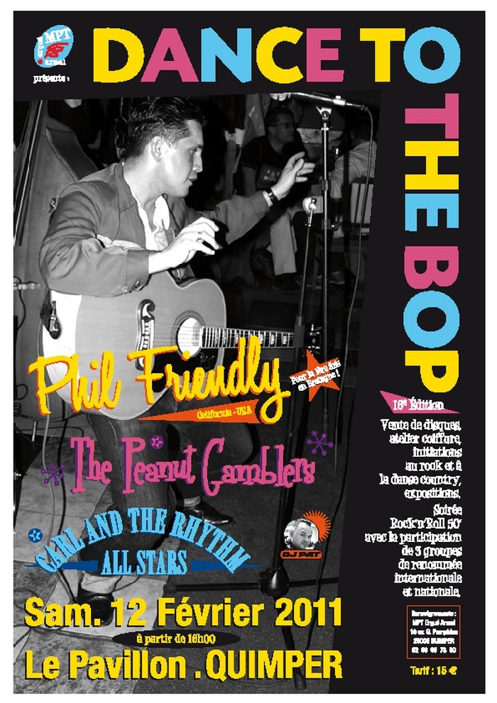 22. Pour ceux que cela interesse....ou qui sont pas loin... Le 12/02/2011 à 20:00 Animation : DANCE TO THE BOP Le plus grand rendez-vous finistérien des amateurs de danse et de musique Rock’n roll des années « ‘50 », et de tous les curieux! Laissez vous porter au rythme des musiques rock et rockabilly des groupes de renommée internationale et/ou nationale: ... Phil FRIENDLY (USA), Carl and The Rythm All Star (F) et The Peanut Gamblers (F). Nouveauté cette année des animations dans l’après-midi : atelier coiffure en collaboration avec l’école de Cuzon, expositions de voitures américaines, ventes de vinyles, initiations aux danses rock et country... Les propriétaires de véhicules anciens (motos, voitures...) sont les bienvenues, un parking est prévu à cet effet. ENTREE GRATUITE POUR LE PROPRIETAIRE Programme : 16h30 - 18h30 : Animations, initiations et expositions 19h - 20h30 : Apéro Rock’N Roll (restauration) 21h - 2h : soirée musique et danse Tarifs: - Enfants de - de 12 ans : gratuit - Jeunes de 12 à 25 ans + personnes en situation précaire : 7 € - Adhérants : 10 € - Tarif normal : 15 € Billeterie : vente à partir du lundi 24 janvier à la MPT, attention pour les prix adhérants la billeterie s’arrête le 11/02 à 19h Ouvert à tous Lieu : Pavillon (Quimper) Contact : MPT - info@mpt-ea.org Tél : 02/98/90/78/00