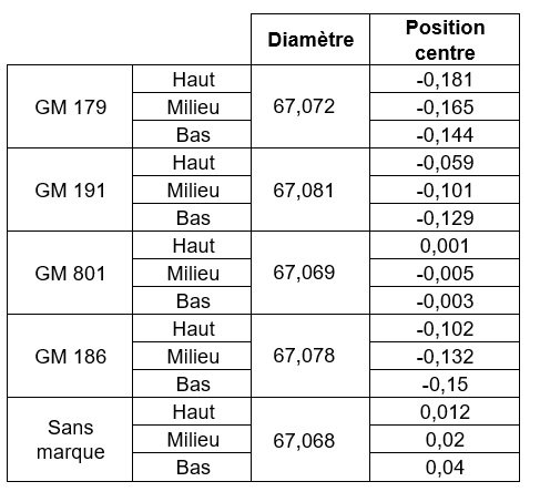 Bonjour, Voici les mesures des cylindres. Une mesure à 10mm du haut du cylindre, l'autre au milieu, l'autre à 30mm du bas. Niveau ovalisation, le maximum que j'ai constaté est 0.025mm sur le bas des cylindres uniquement. Ces valeurs me plaisent pas mal, qu'en pensez vous ?