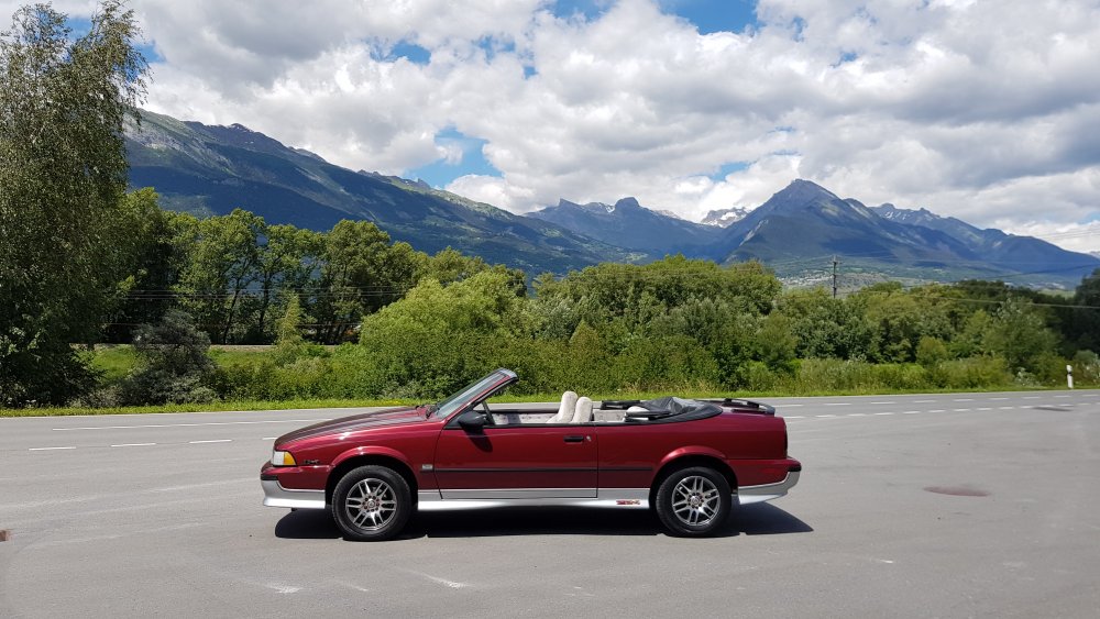 Bon les petits nenfants, quelques news. Déjà, pour commencer, changement de roulettes: Avec pneus Continentoches comme neufs et surtout écrous anodisés bordeaux pour un total-look kékouze. Blague à part, moi, j'aime beaucoup. Ça la rajeunit d'un bon bout, et ces jantes sont quand même un peu plus raffinées que celles d'origine. C'est pas que j'aimais pas les jantes d'origine puisqu'en bon état, vraiment symboliques du modèle mais aussi d'une époque. Mais bon...je voulais voir une fois si cette vibration de merde qui faisait branler toute la bagnole entre 70 et 100km/h ne venait pas par hasard des pneus arrières, qui étaient sur la bagnole quand je l'ai achetée. Et j'avais ce set d'American Racing AR-49 unilug GM/Mopar en 15x7 depuis des plombes au fond de mon bordel, achetées comme neuves avec les pneus une bouchée de pain en 2015 pour je ne sais meme plus quelle bagnole et jamais montées...quand par hasard j'y ai repensé et que j'ai vu, incrédule, que c'était la bonne taille de pneus et le bon entraxe, j'ai dit vendu! Et devinez quoi? Eh ben putain...cette vibration que je cherche à diagnostiquer depuis 2 ans et que je ne trouvais pas...ben c'était ces saloperies de pneus arrières chinois de merde! J'ai strictement plus rien nulle part, elle est sur des rails. Zéro vibration, que dalle peu importe la vitesse (enfin peut-être au-dessus de 150, j'ai pas essayé...)...bref, c'est juste parfait. La bagnole est métamorphosée. Avant je ne pouvais pas taper dedans sérieusement, elle branlait tellement en courbe qu'elle survirait, obligé de décrocher, ça faisait sérieusement soucis. Maintenant je peux arsouiller comme un goret, ça vire à plat, elle est scotchée parterre et ces Continental sont vraiment assez épatants, ça tient le pavé méchamment. Et je peux vous dire qu'avec le pied lourd ce petit 2,8 transversal se défend bien, elle est agile, plutôt vive...pour du ricain c'est du genre efficace...et pas qu'en ligne droite, disons. Enfin bref c'est top, elle fonctionne comme jamais cette caisse. Je commençais vraiment à en avoir plein le cul de cette vibration, le genre de détail qui te pète rapidement le plaisir de conduite...pour le coup cette fois elle est vraiment au point. Je lui ai mis 400 bornes dans le cornet depuis hier soir, inauguré le premier méchant coup de soleil de la saison...c'est vraiment un bonheur, cette fois elle est aboutie. Pas rentendu parler non plus du moteur d'essuie-glace, il semblerait que ce problème-là soit lui aussi réglé. Allez...maintenant reste qu'à rouler. L'été arrive à point nommé. Quelques tofs pour la peine: Quand je repense à ce que j'avais acheté derrière un silo à grain il y a deux ans pour 200 balles, quand je la vois aujourd'hui, je commence quand même à avoir l'impression d'avoir accompli quelque chose.