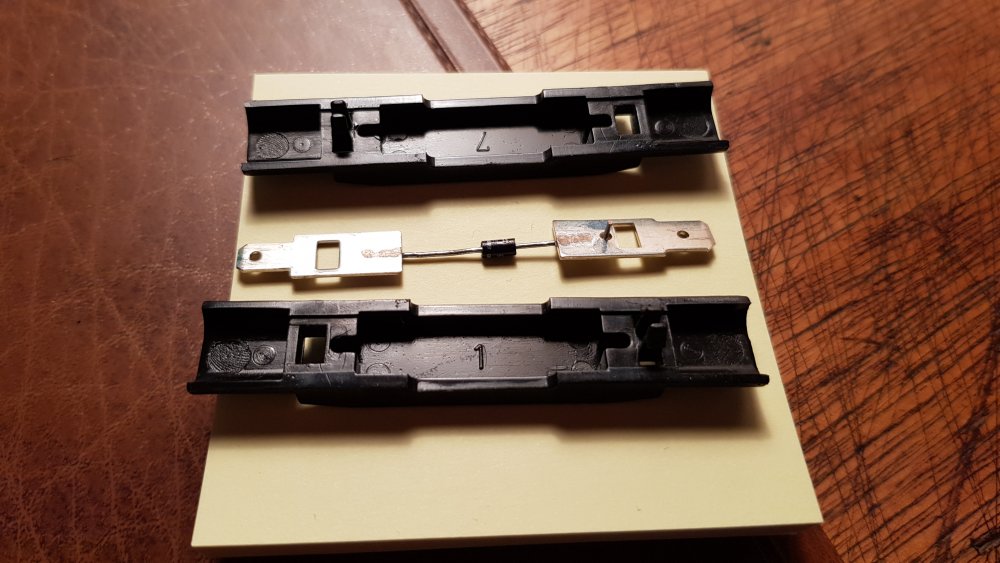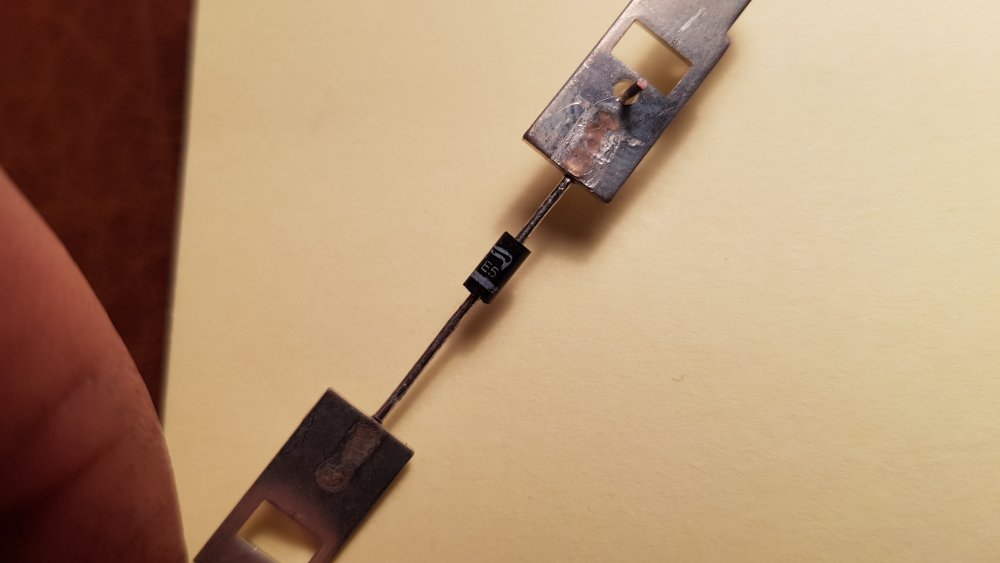 C'est joli les diodes! C'est tout rond, c'est tout petit, c'est tout mignon...non vraiment j'aime bien...c'est vraiment super cute! Sauf...que ça marche pas. Et que j'y connais rien. Problème: Peugeot 306 cab phase 1. Je sais. Ouais, je sais. Plus précisément: Le verrouillage et déverrouillage de la malle de coffre. Je vais essayer de décrire ça comme je peux...j'y connais pas grand chose. J'ai acheté cette bagnole, abandonnée sur un terrain en terre depuis 13 ans, ensevelie jusqu'aux jantes, parce que visiblement le mécano qui avait été chargé de la réparer à l'époque n'avais jamais trouvé pourquoi plus rien ne fonctionnait ou presque électriquement. Et moi, j'y ai passé des semaines de diag, mais avec ma tronche de con, j'ai trouvé une liste d'environ 116 problèmes (actuateurs de portes, fusibles, lignes sectionnées, serrures qui grippent, etc.) et je suis arrivé à tout refaire fonctionner...j'ai trouvé une donneuse que j'ai faite cannibaliser en Allemagne et maintenant tout remarche, quand je plante la clé dans la porte ça fait -"Bzîît" et tout s'ouvre, et dans l'autre sens tout se ferme. SAUF une connerie! Qui traine sur mon établi depuis des mois parce que je voulais aller voir en casse mais que, 36 projets en simultané oblige, j'ai pas pris le temps, et du coup ça traine...sauf que je me suis décidé à nettoyer ledit établi la semaine passée et voilà que je retombe dessus. C'est ça, cette chose, cette petite merveille d’ingénierie de Sochaux: Ce truc est monté entre deux fils derrière une garniture du coffre, les deux fils sont montés en ligne depuis l'actuateur de verrouillage de la porte droite: Un qui envoie du courant au moteur de malle AR pour ouvrir le coffre, l'autre pour le verrouiller. Et au milieu cette merde qui ne marche pas. Quand je la met le coffre se ferme mais ne s'ouvre jamais, et quand je l'enlève et que je mets les fils en direct l'un sur l'autre, ça s'ouvre et se ferme nickel à tous les coups. J'imagine que ça doit servir de disjoncteur en cas de court-jus ou de contact qui colle, une sorte de ballast resistor des années 90...bref. Évidemment, dans mon éternel soucis de l'origine, simplement le foutre à la benne et connecter les fils en direct, c'est impossible. Donc j'essaie de comprendre. Pièce évidemment introuvable chez Pigeotte et sans succès pour le moment en occasion...alors finalement je l'ai ouverte et j'ai pu voir que c'était juste une connerie de diode dans un boitier en plastique. Voilà ce qu'on peut y lire: Respectivement iN , 4003 et E5. Question: J'y connais rien en diodes. J'imagine que je peux simplement dessouder celle-là et y souder une neuve et que ça va marcher, non? Enfin c'est ce que je me disais...du coup j'ai tapé iN4003 dans Grogueule et j'ai vu 150'000 résultats, du coup, j'ai pris peur. Il me faut quoi comme infos pour trouver la même si possible sur E-Bay? Y'a des "valeurs" à ces diodes? Ces "iN4003" ça à l'air d'être une sorte de "catégorie" de diodes...mais comment trouver exactement la même? Si vous y connaissez quelque chose...moi pas encore...mais j'espère bien apprendre parce que ça m'intéresse! Et puis si je peux régler ça en trois clics, plutôt que de faire le tour du pays et me geler les doigts pendant une heure pour y accéder et pour finalement en dénicher une d'occase qui claquera dans 10 jours, finalement j'ai tout à y gagner! Et surtout je pourrais remonter tout le coffre qui est en vrac depuis des lustres à cause de cette petite bricole alakon...ce qui me procurerait une incommensurable joie! Thanks!