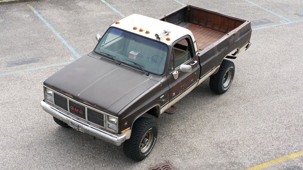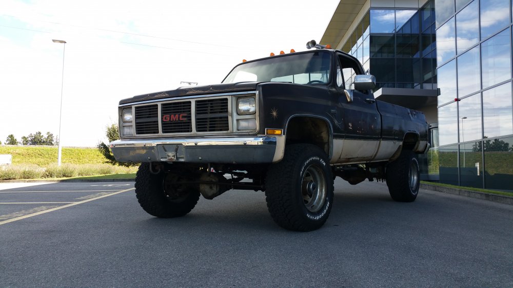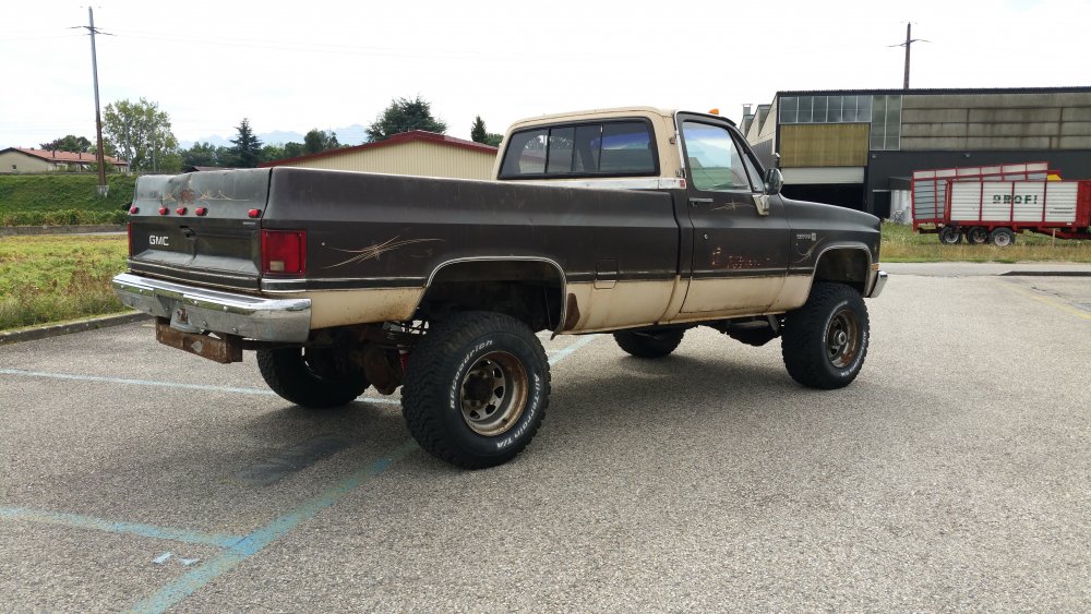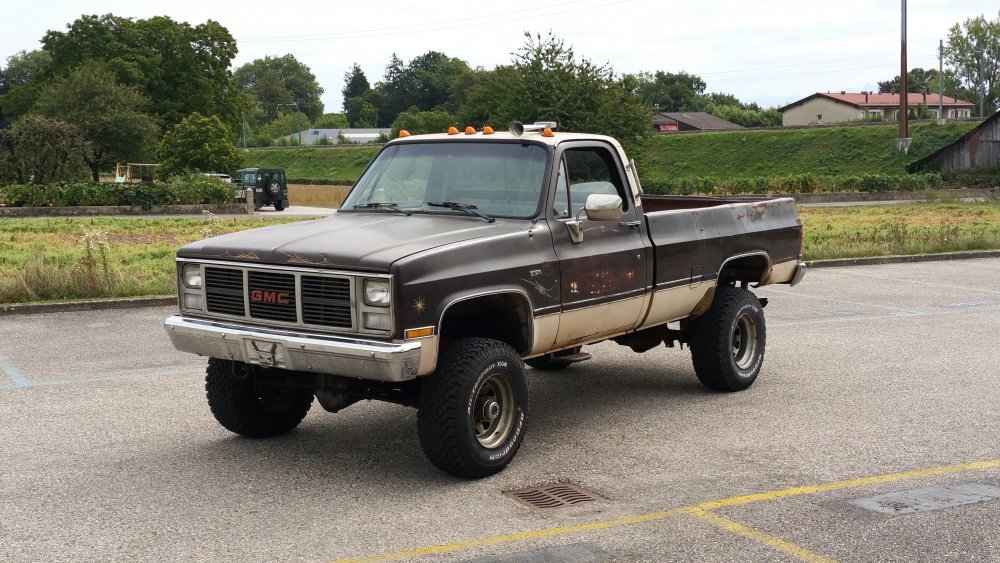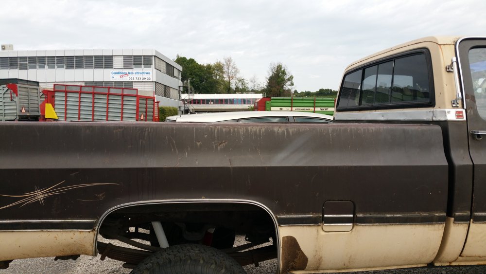 Bon ben comme certains l'ont peut-être suivi sur le topic mis en lien deux posts plus tôt, j'ai eu tout à coup, comme c'est toujours le cas avec moi, c'est à dire pressant comme une envie de pisser, l'envie de faire tourner le GMC. Motivation principale: Fermer la gueule à un collègue de travail qui à eu la mauvaise idée de me narguer, alors que je venais de lui dire que j'hésitais à relancer l'acquisition d'un International Scout II, que de toute façon, t'as déjà 36 bagnoles, pis ton GMC là c'est presque le même, pis tu l'as même pas fait tourner...bref, la rengaine habituelle du mec bien conformiste à qui j'aimerais à tout prix ne pas ressembler... Alors je lui ai répondu le fond de ma pensée: -"T'façon, le jour ou j'aurais décidé, ce sera trois jours de boulot et il tourne. " ...et aussi pouvoir le déplacer, accessoirement. Parce qu'un 3500 merde, c'est lourd, et les 33" sans DA, ben re-merde, ça tourne mal. Résultat? Il tourne. Il roule, il freine, il recule...enfin bref, rien à redire. Si je ne fais pas tel ou tel boulot, c'est parce que j'ai pas envie, simplement. J'aime bien faire les choses avec entrain, quand j'ai de la motivation, quand j'ai envie...pas juste faire pour faire, "parce qu'il faut le faire", rien à foutre, c'est une passion, pas le boulot ni le bagne. Et le deuxième problème c'est que je suis encore une quille en méca, j'ai pas la théorie, j'ai d'énorme lacunes, quand je connais pas je flippe avant de réfléchir...bref...sur ce genre de boulots j'apprends tout en faisant, et en plus je dois souvent me canaliser en même temps...mais il y à des périodes ou j'ai plus confiance en moi, comme ces temps, et du coup c'est nettement plus propice à ce genre de premières. Du coup avec l'aide des tôliers d'ici, qui m'ont apporté une aide et surtout une vulgarisation technique indispensable, et que je remercie encore une fois, ben j'ai sur une semaine fait les travaux suivants: -Vidange de boite -Vidange de DA -Prépa à la mise en route (sortir les bougies, ATF dans les cylindres, faire longuement tourner le bloc au démarreur, tomber les cache-culbus pour jeter de l'huile par le haut, etc.) -Posé l'allumeur neuf, raccordé les fils neufs aux bougies neuves et à la bobine neuve -Calé au PMH -Connecté les pompes à essence, réparé un mauvais contact entre l'ECM, le "hot fuel module" et le switch d'inversion des réservoirs -Tombé le faisceau moteur quasi complet, la boite à fusible pour aller faire une dizaine de soudures à l'arrière, ou un gros départ de feu avait été réparé avec des saloperies de connecteurs de supermarché...l'accès n'en parlons pas, j'en ai chié comme un âne. -Mis 40 litres par réservoir pour la mise à feu -Dégrippé les injecteurs -Vérifié l'état d'un grand nombre de composants, dont l'ECM, la sonde TPS et bien d'autres trucs. Je suis venu le samedi pour le démarrer, tout était prêt jusqu'aux extincteurs, seaux d'eau et les vieux conduits de poêle à bois pour diriger les gaz d'échappement jusque dehors...mais rien à faire, j'avais pas d'impulsions aux injecteurs du TBI. J'ai trouvé un moyen assez rustique de les dégripper le dimanche matin après avoir potassé toute la nuit, ça a marché, et en milieu de matinée dimanche il est parti au premier coup de clé, dans un vrombissement terrible qui a envoyé valser dans un spectaculaire nuage la poussière et toutes les merdes accumulées durant les 23 dernières années d'abandon. Il a tout de suite tourné juste, à trouvé son ralenti, aucun bruit mécanique parasite...j'ai pu le faire tourner plus d'une demi-heure jusqu'à pleine chauffe. Depuis, j'ai: -Calé l'allumeur à la strobo -Changé le maitre-cylindre, longuement purgé les freins -Refait deux vidange du LDR, et une du liquide de DA -Changé une petite durite de chauffage qui a percé au quatrième démarrage -Désembrayé la boite de transfert du mode 4x4 HI...hier...il me semblait bien qu'il ballottait pas mal sur asphalte. Je l'ai sorti deux fois, il roule bien: Accélérations terribles, ça arrache (454 inside), freinage parfait (droit, court, ferme, assistance hydraulique efficace), direction fluide. Maintenant, les problèmes sous-jacents sont les suivants: -Amortos morts devant et derrière. -Bushings de lames avant HS, polyuréthane qui part en miettes -Bushings d'extrémités de barre stab avant bien affaissés, à remplacer -Visco-coupleur HS, embrayé en permanence -Boitier de DA à réviser, fuites -Pompe de DA à réviser, fuites -Bocal de liquide de DA déporté à remplacer, ressoudé tellement trop fort qu'il a un trou sur le côté qui laisse pisser l'ATF et pourri tout l'avant du bloc. -Le radiateur, salement colmaté de calcaire, tartre et dépôts gras, qui va demander encore plusieurs rinçages à l'eau claire, ensuite je lui mettrais un nettoyant dans le gosier pour éliminer un maximum de ces foutues boues. Chauffe aussi à surveiller, si ça chauffe, c'est départ chez le spécialiste direct pour remplacement du faisceau, vu l'aspect général, pas la peine d'essayer d'économiser des bouts de chandelles. -Thermostat et son joint à faire une fois que j'aurais du LDR globalement clair, à la jauge il fait son boulot, mais après 23 ans et pour ce que ça coûte, je préfère assurer. -Connecteurs d'injecteurs à remplacer, bien fondus par le départ de feu...c'est purement esthétique, j'avoue -Câble d'accélérateur, pareil, gaine bien fondue par le feu, du coup même après graissage il est dur à monter dans les tours progressivement, c'est brutal...mais ça peut aussi être le fait de la tringlerie du TBI ou simplement du couple du big block, j'en sais rien. Tout est commandé, que de la belle pièce, ça devrait arriver la semaine prochaine. J'ai eu pas mal de peine à déterminer la hauteur de la réhausse, qui est finalement de 4", et de la peine aussi à trouver les amortos qui vont avec, j'ai finalement trouvé chez Rancho, du top matos!