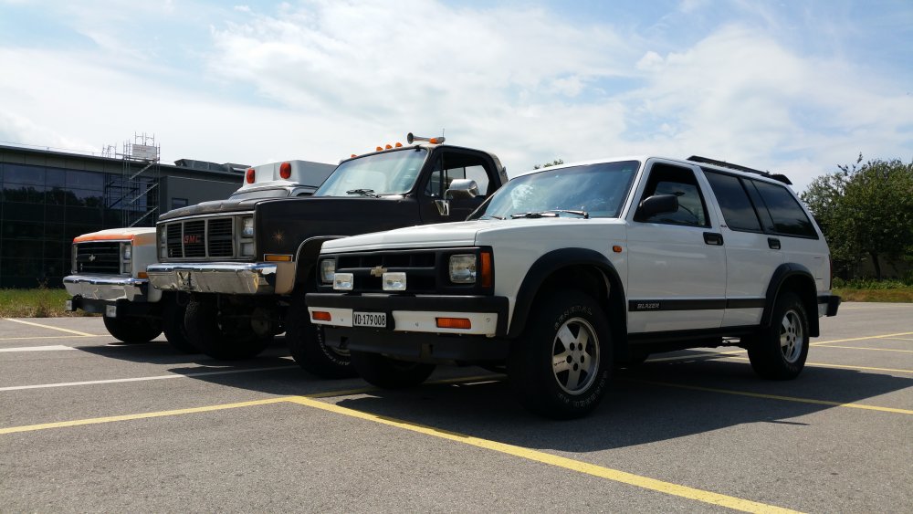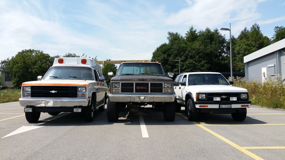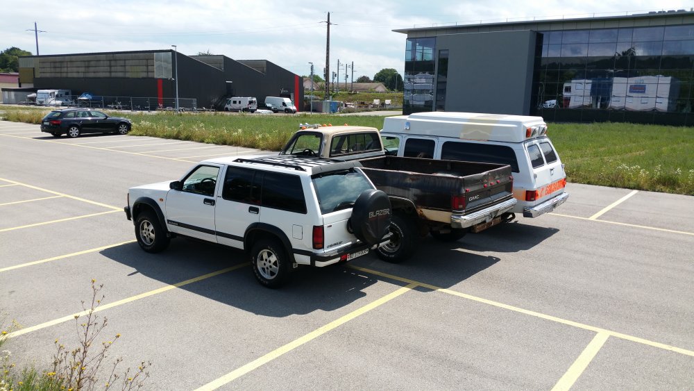 Ah oui et au fait j'ai bien vu les messages en rapport à la taille, oui c'est gros, non j'ai pas encore eu le temps de mettre ma Twingo à côté, oui je veux le faire et depuis longtemps, ouaaaiiiis en serrant bien le montant de benne je devrais même pouvoir la monter dedans, non je pense pas que j'aurais le temps de faire les tofs ce weekend parce que j'ai déjà deux bagnoles à rouler impérativement, mais oui, ça arrive, et non, j'oublierais pas. Voilà! Mais pour illustrer, avec ce que j'ai sous la main sur mon laptop, voilà ce que ça donne à côté du S10 qui fait grosso merdo la taille d'un X5...les full size c'est encore clairement une taille au dessus: Le Burbulance est identique en taille, rapport au GMC il à simplement la réhausse de 4,5" en moins et la hauteur des pneus (de la monte stock aux 33" Baja Champion Dursàtourneràlarrêt).