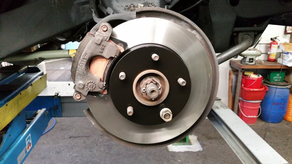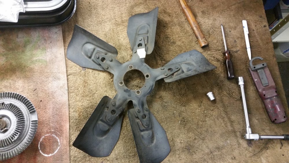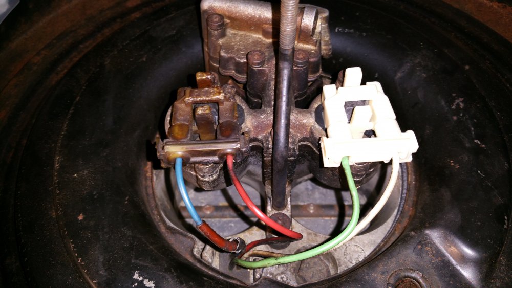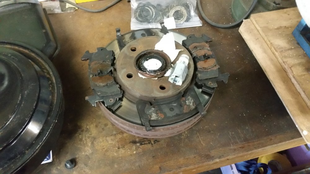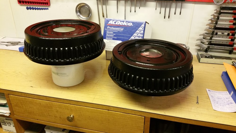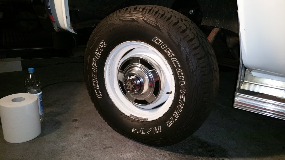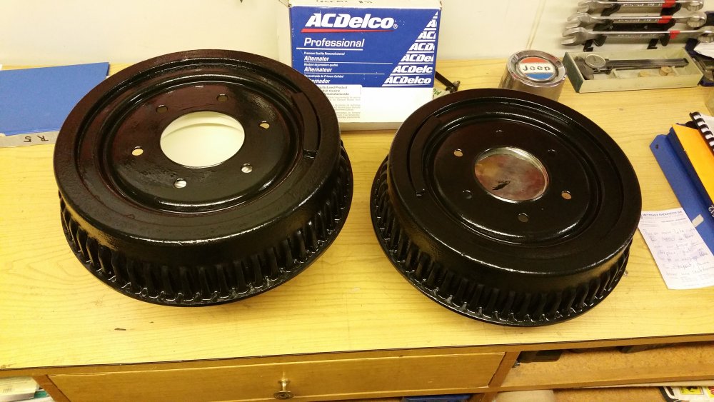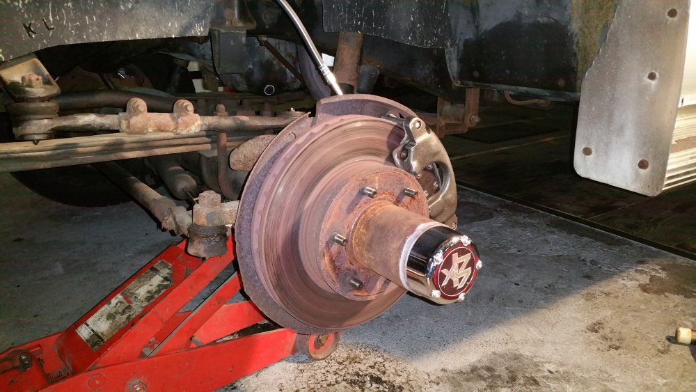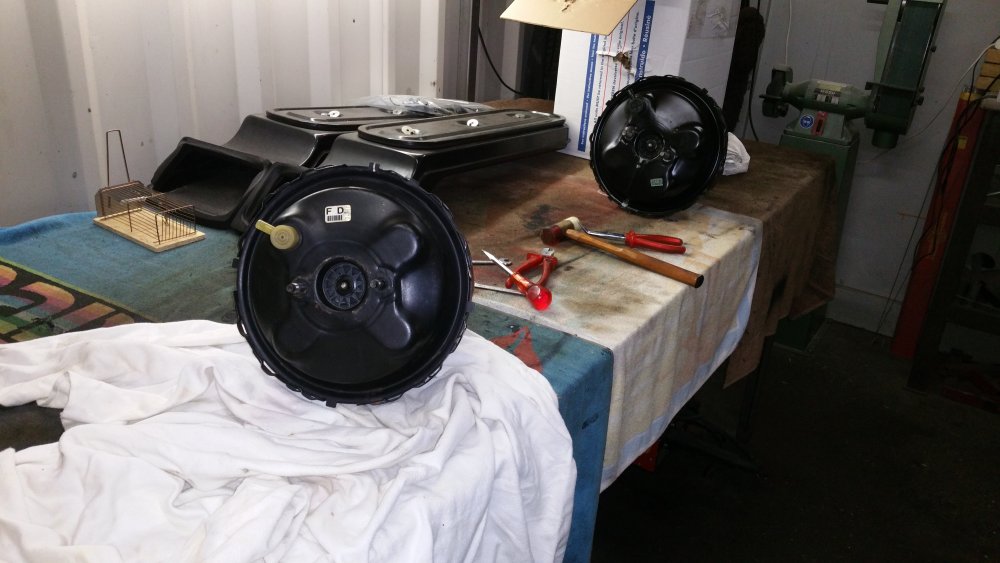 Et maintenant quelques travaux sur le Burbulance! Ces derniers jours j'ai mis à jour quelques trucs qui me démangeaient, dont: Viscocoupleur, l'ancien était bloqué embrayé par deux vis, soit à cause de l'utilisation en conditions extrême quand il était en service, soit parce qu'il avait rendu l'âme...bref...je saurais jamais. Heureusement j'en avais un bon d'occase dans les cartons, 'va bien, m'a rien coûté en plus! Graissage complet du train avant, croisillons et autres points de graissage: Re-check-up complet du freinage: Dépose des tambours AR pour dépoussiérage et contrôle, mise en peinture des tambours neufs que j'avais posés bruts dans la précipitation à l'époque. Ensuite dépose des freins avant, détalonnage des plaquettes et graissage à neuf des surfaces d'appui à la graisse PTFE, remontage. Remise en place de l'assistance d'origine, je l'avais changée pour une neuve au moment ou je rencontrais des problèmes de pédale molle mais sans amélioration, donc retour de celle d'origine. Rare MC "lévitationnel", une option peu répandue. Du coup, ben putain, depuis 3 ans au moins que je les ai dans un carton, maintenant que j'en ai fini de démonter les roues, j'ai pour la première fois pu poser les enjoliveurs d'origine! Miaaaaam! Donc voilà. Part toujours au quart, tourne toujours rond comme une balle. Se ramassera sûrement deux joints d'entrées de ponts et un de sortie de boite en novembre, je vais commander ça au plus vite. Pour l'instant je m'affaire à essayer de sortir le bouchon de remplissage du pont arrière qui est du genre coincé...quoi qu'il en soit, ça va viendre! J'ai une belle bouteille de butane neuve et pas prévu de me laisser emmerder éternellement...
