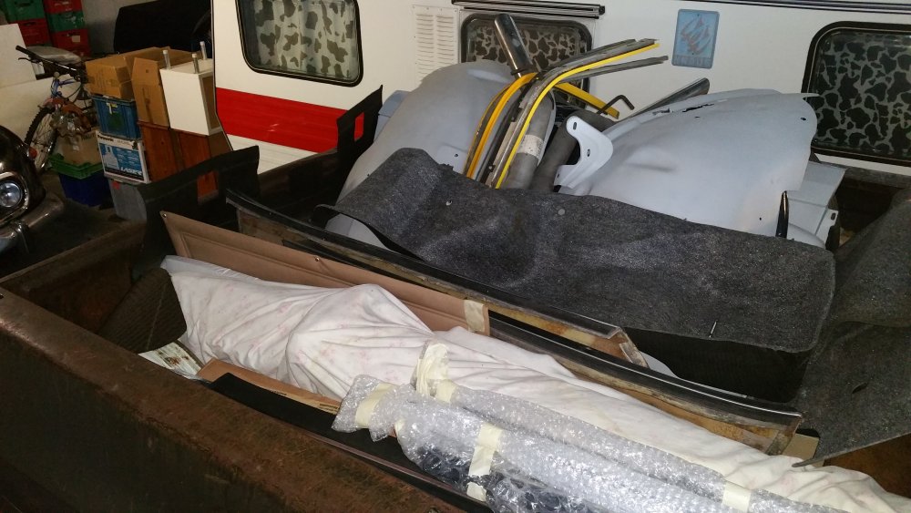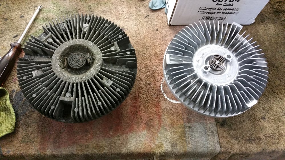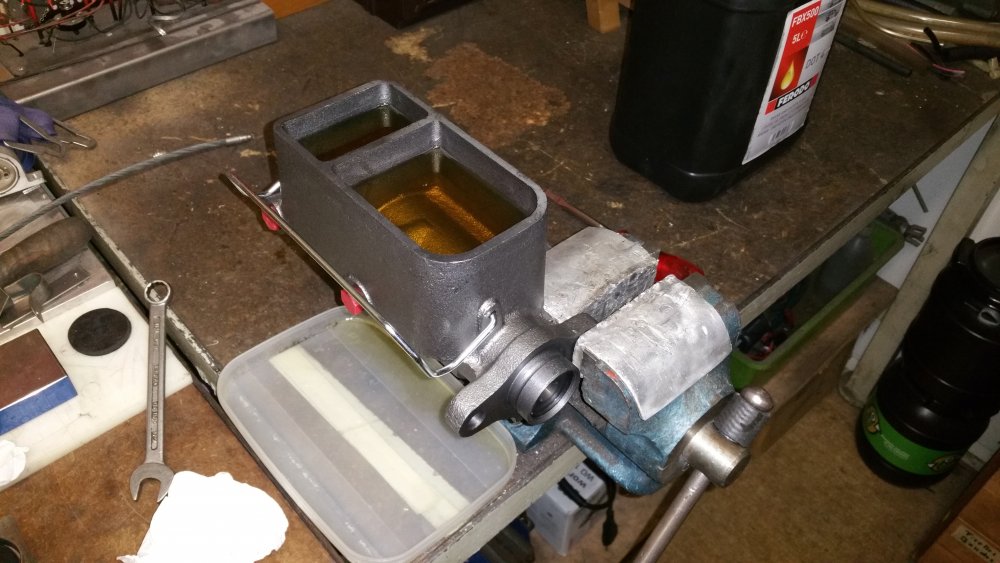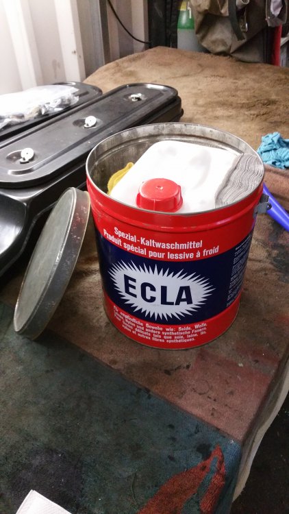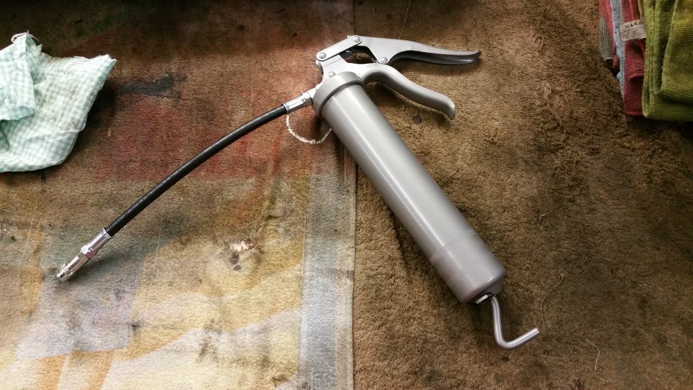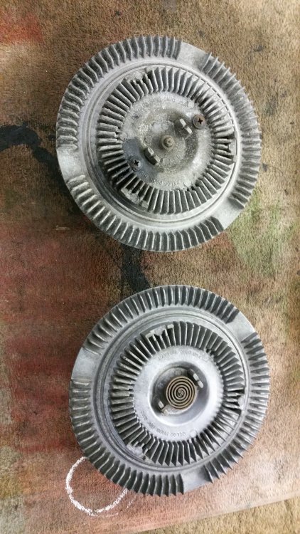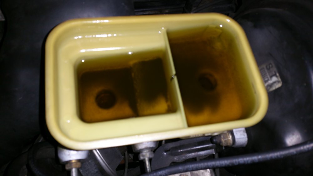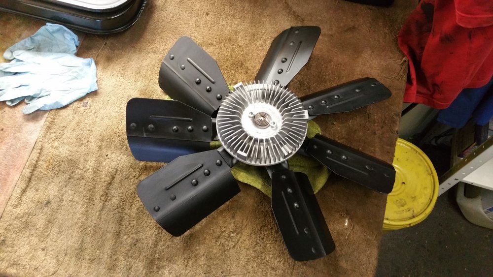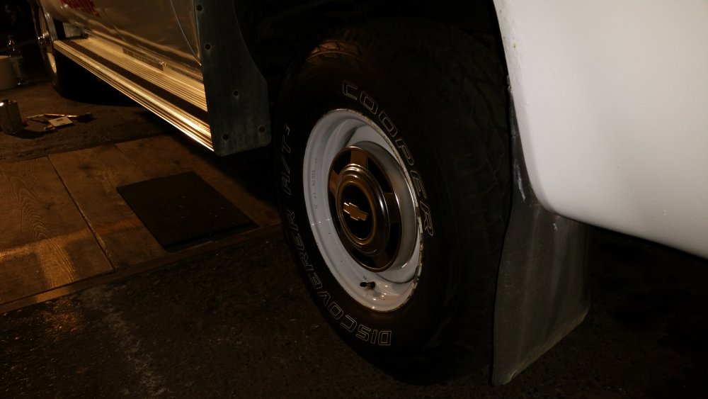 Et maintenant quelques travaux sur le Burbulance! Ces derniers jours j'ai mis à jour quelques trucs qui me démangeaient, dont: Viscocoupleur, l'ancien était bloqué embrayé par deux vis, soit à cause de l'utilisation en conditions extrême quand il était en service, soit parce qu'il avait rendu l'âme...bref...je saurais jamais. Heureusement j'en avais un bon d'occase dans les cartons, 'va bien, m'a rien coûté en plus! Graissage complet du train avant, croisillons et autres points de graissage: Re-check-up complet du freinage: Dépose des tambours AR pour dépoussiérage et contrôle, mise en peinture des tambours neufs que j'avais posés bruts dans la précipitation à l'époque. Ensuite dépose des freins avant, détalonnage des plaquettes et graissage à neuf des surfaces d'appui à la graisse PTFE, remontage. Remise en place de l'assistance d'origine, je l'avais changée pour une neuve au moment ou je rencontrais des problèmes de pédale molle mais sans amélioration, donc retour de celle d'origine. Rare MC "lévitationnel", une option peu répandue. Du coup, ben putain, depuis 3 ans au moins que je les ai dans un carton, maintenant que j'en ai fini de démonter les roues, j'ai pour la première fois pu poser les enjoliveurs d'origine! Miaaaaam! Donc voilà. Part toujours au quart, tourne toujours rond comme une balle. Se ramassera sûrement deux joints d'entrées de ponts et un de sortie de boite en novembre, je vais commander ça au plus vite. Pour l'instant je m'affaire à essayer de sortir le bouchon de remplissage du pont arrière qui est du genre coincé...quoi qu'il en soit, ça va viendre! J'ai une belle bouteille de butane neuve et pas prévu de me laisser emmerder éternellement...