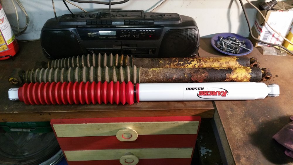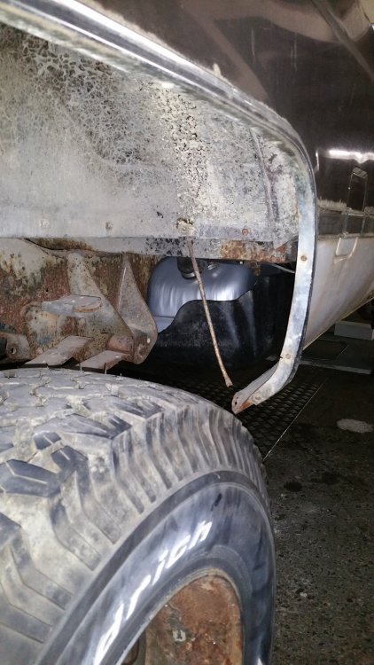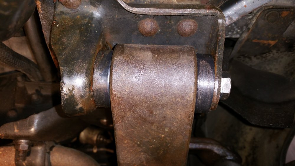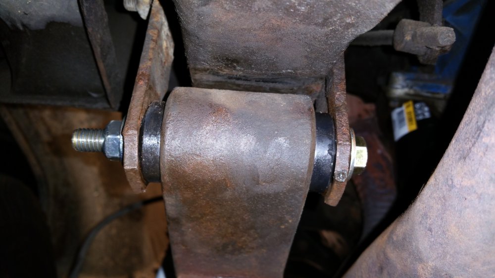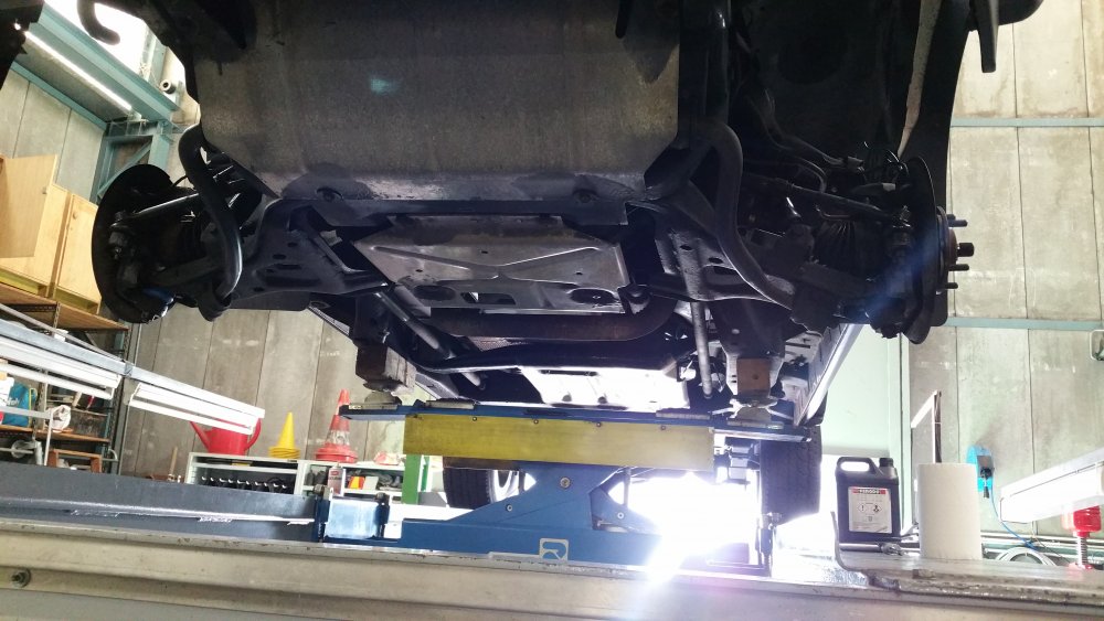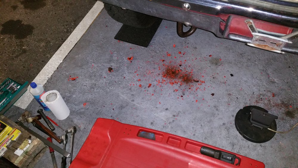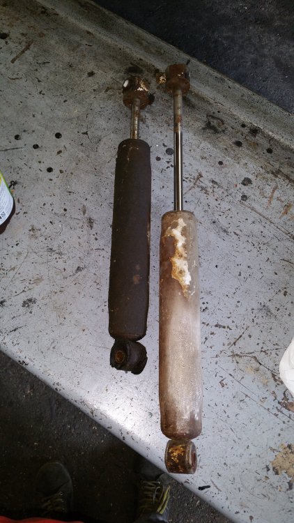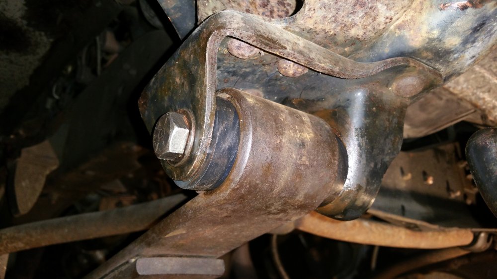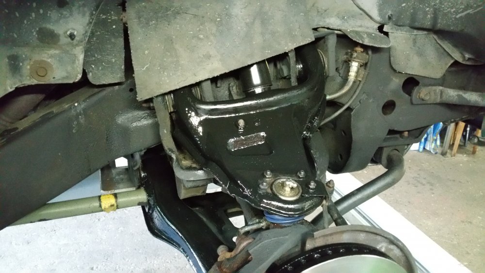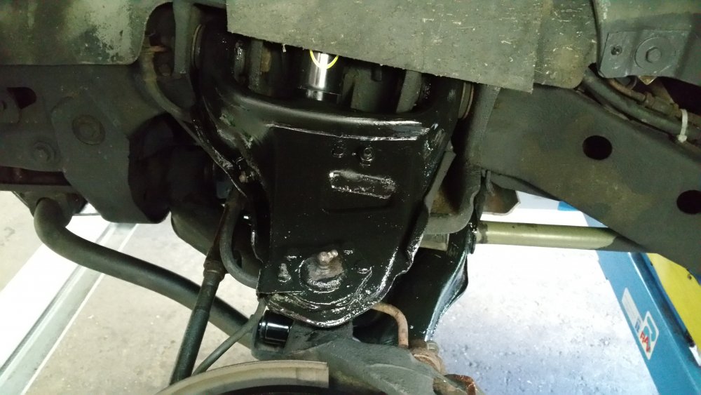 Bon ben je répare en loucedé...lundi et mardi ça a bien avancé: Hormis l'esthétique indiscutable, deux amortos sur 4 étaient écrasés-morts: Un devant et un derrière, sauf erreur les deux à gauche. Le pire job vu le poids du train avant et les paquets de lames renforcés par deux lames maitresses de chaque côté à compresser à la main au moment du remontage...deux jours après avoir fini j'ai encore mal aux bras... Bon le bon côté c'est que les anciens étaient pas trop compliqués à démonter...tu souffles contre et ça sort tout seul... C'était le moment, les lames posaient sur les longerons et le train avant était désaxé de 2 bons centimètres par rapport au châssis...et ça date pas d'hier, aux endroits ou les lames posaient sur le châssis le métal est beau nu. Je note aussi que le gros goret qui avait posés les anciens silent-blocs (les oranges, en miettes), l'avait fait comme une salope: Boulons pas du même diamètre et pas de même longueur entre gauche et droite, silent-blocs de mauvais diamètre et montés sans entretoises métalliques et donc qui se limaient sur les boulons partiellement filetés, aucune trace de graisse de montage quelconque alors qu'il en faut absolument avec du poly, 1 rondelle sur 2 et les autres manquantes, silent-blocs avant sur-serrés et les arrières tout juste amorcés à la main, c'est la rouille qui les empêchait de se barrer...bref...du grand art. Boulot du siècle. Tout à la poubelle et on recommence. Ah ouais et rien à voir avec la choucroute mais on voit que j'avais bossé sur les réservoirs, après 4 ans je viens de remarquer seulement hier qu'on les voyait par les passages de roues: La vie est pleine d'émerveillements. Ah ouais et faudrait réparer l'attache du bas d'aile là, je sais, on me l'a déjà dit 112 fois. Elle restera cassée. A suivre! Encore au programme (demain dans la journée): -Connecteurs d'injecteurs Repoussé parce que c'est pas indispensable et parce que c'est une infâme merde à faire (conception): -Bushings d'extrémités de barre stab' avant. Et dimanche si j'ai le temps, sortie du garage et 10 bornes pour faire bosser les suspattes et pour que tout ça prenne bien sa place...et aussi pour se marrer et taquiner le big bloc.