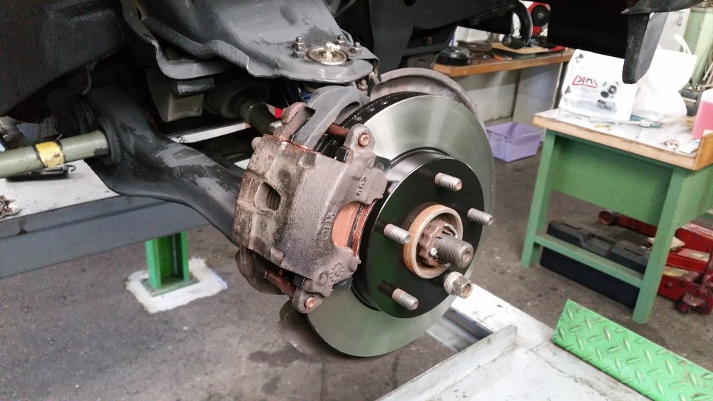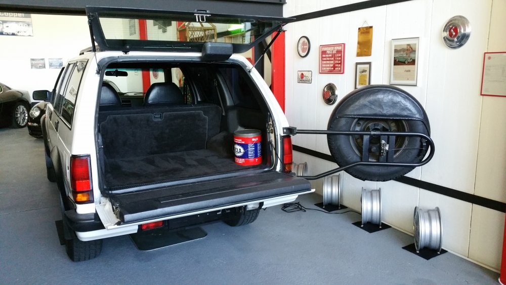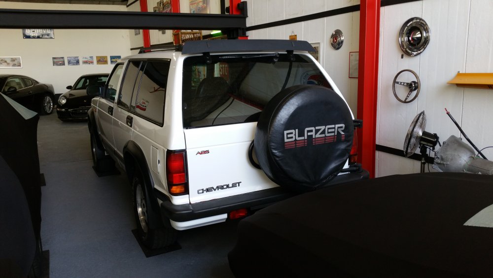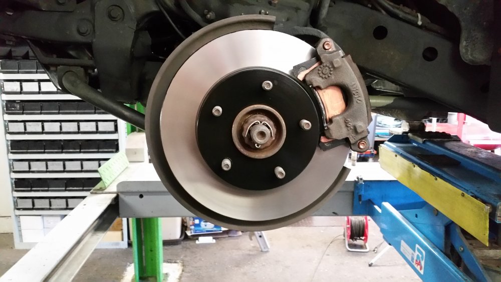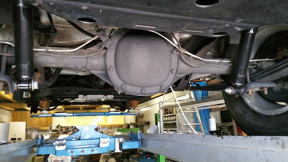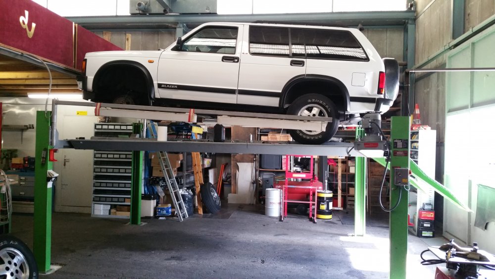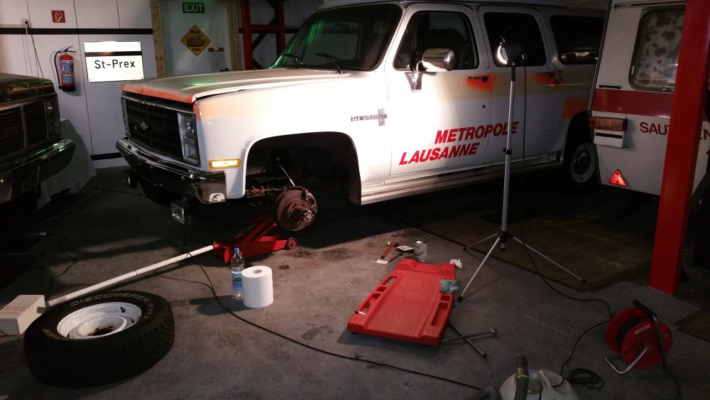 Merci! Je te rassure, c'est qu'à moitié du préventif, puisque tout ça est déjà à 50% mort. Bon ben comme prévu, c'était réparé lundi soir...la preuve: Avec encore une petite fantaisie puisque j'avais du temps en rabe: J'ai repeint les triangles. Bah ouais, 'fallait accorder les triangles avec les disques, normal. Et donc descente du lift lundi soir, et retour à sa place: Et ce après la trouille de ma vie! Lundi 16h00 alors que j'ai tout terminé, je le descends du lift et je fais le tour du bâtiment par la route pour aller le remiser...et alors là...je chie aux frocs. A chaque tour de roue j'ai un bruit de ferraille terrible, du genre: -"klong, klong, klong!"...je me dis: -"Et voilà, ça y est, j'ai buté le pont. J'ai trop serré, j'ai aplati le crush sleeve, je suis en train de bouffer les roulements, dans 30 bornes j'en suis pour 2500 euros de révision complète, le déménagement dans 10 jours je l'ai dans le cul, j'ai plus de Blazer, je peux le foutre loin, je suis mort, quel con!" Etc, etc. Partagé entre l'envie de quand même aller le ranger comme prévu et de rentrer à la maison pleurer, et la possibilité de le remettre vite sur le lift, pour battre le fer pendant qu'il est chaud (et accessoirement finir la journée à 22h30 plutôt qu'à 17h30...), je me calme, je fais demi-tour et retour sur le lift. Je vais dessous, je vois rien, je fous le train arrière dans le vide et je passe les vitesses roues dans le vide: Rien, aucun bruit. Je prends l'arbre à deux mains, je me suspends dessus, je le tourne dans tous les sens: Aucun bruit. -"Putain, chier, ça sent que ça va encore faire du bruit seulement roues au sol avec de l'effort sur la transmission, histoire de s'emmerder jusqu'au bout!" Finalement, je décide de commencer par éliminer le train avant dans les causes possibles. Je monte le train avant dans le vide et je tombe les roues. Et alors là, putain, je me mets à faire tourner les cardans à la main et j'en reviens pas: C'était le disque avant droit, beaucoup plus épais que l'ancien, qui avait une minuscule bavure sur le pourtour, et qui allait taper la flasque à chaque tour de roue...bêtement! Un coup de lime, pris la flasque à pleines mains pour l'écarter du disque, refoutu les roues...et plus rien! Pfffiiiouuuu! OUF! Je l'ai donc rapatrié mercredi après-midi, et j'ai là aussi eu une belle frayeur. Je suis parti du garage, et putain ça freinait bien. Terrible, efficace à mort, plus une vibration, pas un bruit, nickel. Et j'arrive au moment de descendre une très forte pente qui se termine en épingle, et ça roule à 80km/h. No problem, ça freine nickel, et j'arrive en plaine sur un rond-point. Une odeur de ferraille, putain...j'ai tout de suite compris. Arrêté sur le bas-côté, j'ai les freins avant qui crament. J'ai tout checké: Il avance tout seul, je pouvais le pousser à la main au neutre sans aucune résistance...bref...pas de pistons grippés. Bref, j'ai fait 20 bornes après ça pour renter à la baraque, et plus rien. En fait il semblerait que ce soit le liquide (huile?) dans lequel mes copains chinois de chez AcDelco enduisent les disques pour pas qu'ils débarquent du bateau tout rouillés qui se soit consumé. J'avais naturellement essuyé et dégraissé les surfaces de freinage à l'acétone avant montage, mais évidemment que dans les ailettes, c'en était encore plein. Ajouté à cela le fait que ça morde terrible parce que c'est neuf, et surtout les 2500 kilos du bébé et encore plus les jantes en alu avec quasiment pas de refroidissement et dont la dissipation de la chaleur est catastrophique...je pense que c'était juste ça, parce que les étriers relâchent bien, y'a rien qui force, c'est méticuleusement graissé de partout...je vais surveiller, mais je vois pas ce que ça pourrait être d'autre. Belle frayeur en tout cas. A suivre! Le pont est parfaitement silencieux et étanche, ça freine parfaitement...au final que du bon! Une amélioration par mois, si ça continue d'ici 2018 j'aurais transformé la citrouille en carrosse! Il a passé les 198'000 bornes mercredi, ce weekend si j'arrive à trouver un moment j'irais bien lui en mettre 200 de plus, histoire d'inaugurer mes réparations sérieusement.