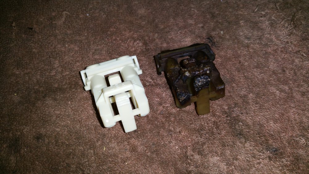 Excatement! Je me réjouis des premiers kékouzes en M3 de leasing qui viendront me coller le cul comme avec la Cougar maintenant...faudra qu'ils aient des réflexes, ça freine plutôt très bien et j'ai pas prévu de poser une barre anti-encastrement. Bon ben la dernière réparation de prévue soit les connecteurs d'injecteurs c'est fait ce midi, avec en supplément une réparation d'un fil blessé réparé il y à sûrement très longtemps, tellement longtemps que la gaine thermo d'époque à pété en deux quand j'ai du triturer les fils pour changer le connecteur. Vu l'accès merdique j'ai préféré conserver la soudure à l'étain qui était dessous, pour une fois très bien réalisée, et j'ai donc longuement découpé la vieille gaine autour du fil avant de geeeeeentiment en glisser une neuve par dessus le connecteur...pas super drôle mais c'est fait. Au passage un bon coup d'aspiro dans la gamelle pour lourder le millimètre de poussière de rouille qui est venu s'entasser là après les premiers démarrages, et refermé. Fini! De nouveau déplaçable! Youpie!