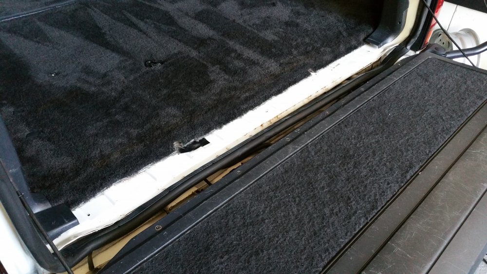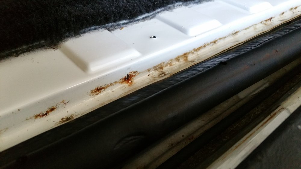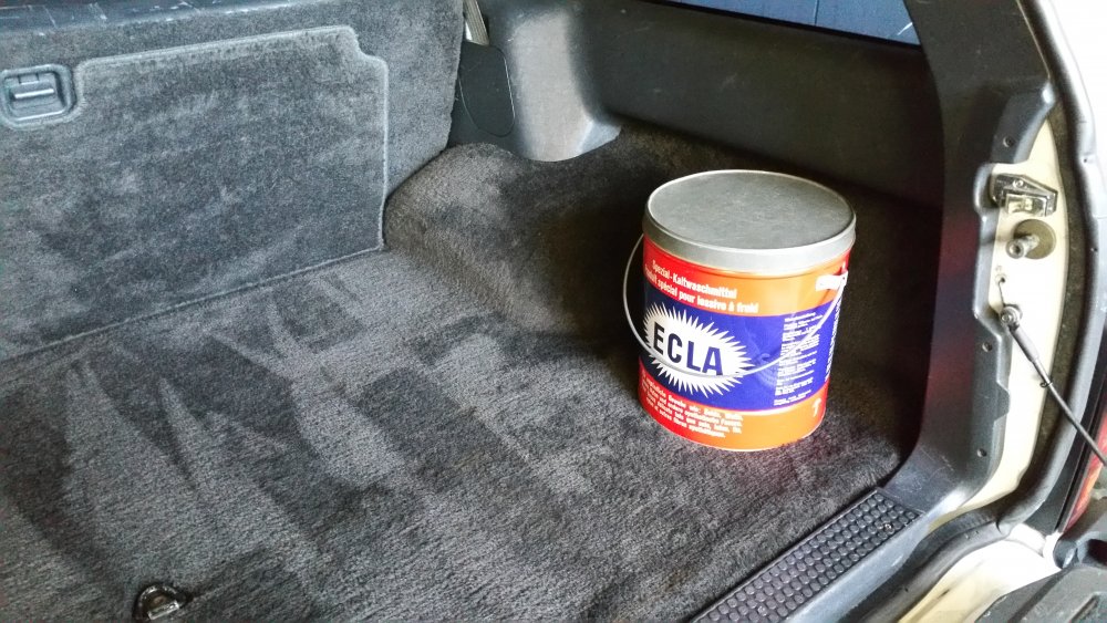 Des news de la bête de somme! Il prend du bon temps dans le showroom puisque je l'ai échangé contre la Cougar que je veux un peu rouler avant la fin de l'été. L'occasion de peaufiner quelques trucs: -Réparation pour la troisième fois du vérin de coffre droit dont la patte de branchement de la masse de la vitre chauffante est usinée différemment de la pièce d'usine, les chinois ont mal copié. J'ai récupéré la patte sur le vieux vérin ACDelco HS et je l'ai installée sur le neuf après adaptation...cette fois elle ne devrait plus pouvoir casser. -Nettoyage complet intérieur (moquettes, panneau de portes, ouvrants, logement de la roue de secours, etc.) et remonté la banquette. Petit nettoyage des cuirs aussi, par la même occase. -Niveaux, vérification des fluides. -Graissage des charnières de portes-capot-coffre -Dépose du seuil de la porte arrière et du joint de coffre, dont je voyais que c'était plein de crasse dessous, et aussi pour aller inspecter l'extrémité arrière du plancher, qui est une vraie maladie sur ce modèle...très bonne surprise, c'est à peine rouge à un endroit, mais rien d'inquiétant: Et au passage nettoyage du seuil lui-même, qui était complètement crado. En démontant je me suis aussi aperçu que le dernier illuminé qui avait démonté avait mixé les vis avec celles de l'entourage du plafonnier, de même longueur mais à têtes plates pour le sol et têtes coniques pour le plafond...j'ai remis tout ça juste. Et pour finir j'ai trouvé dans le déménagement de l'appartement de feu mon grand-père un vieux bidon de lessive en tôle bien sympa et assez gros pour que j'y mette le bidon de 5 litres de LDR que je trimballe systématiquement dans le coffre et qui allait sans arrêt gicler dans tous les sens au moindre virage, j'ai aussi pu mettre avec la peau de chamois, du papier, des chiffons, les quelques outils pour se dépanner...top! Depuis le temps que je cherchais une solution, super content, et en plus si ça venait à couler la moquette ne craint rien. Donc voilà! Repos du guerrier après deux déménagements complets, mais d'ores et déjà prêt à reprendre la route à tout moment (sûrement dimanche prochain)!