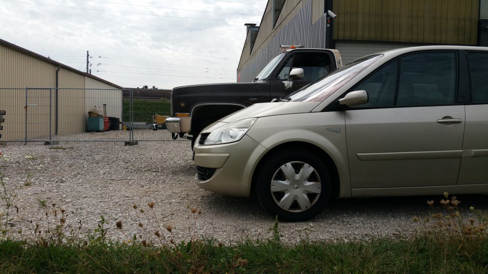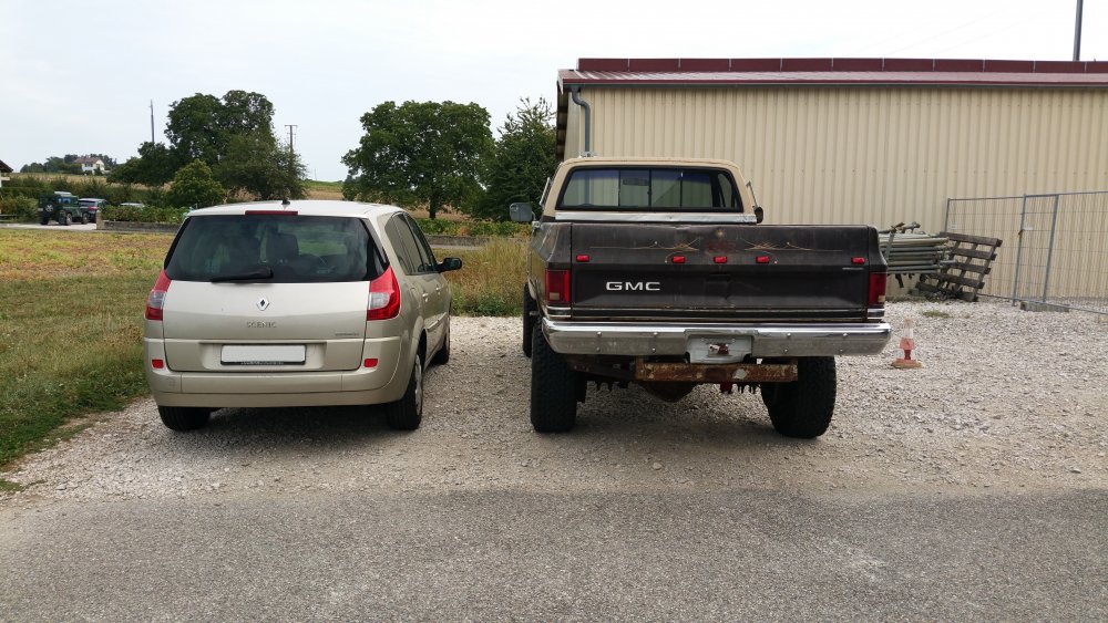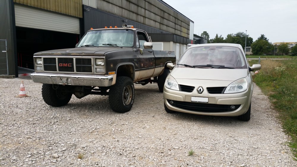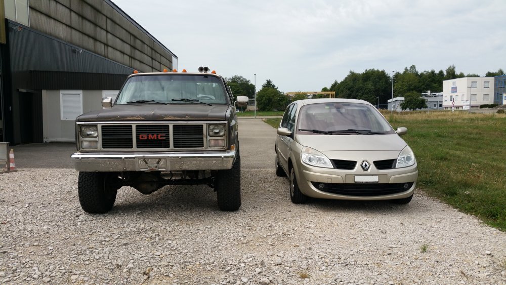 Thanks! Ouaip, il est assez méchant. Perso j'ai pas de mots pour décrire à quel point j'adore ce bahut, en ce qui me concerne c'est la quintessence du pick-up amerlo. Allez, vous m'aviez demandé des tofs à côté d'une bagnole courante, en voilà! J'ai choisi une Yaourtière Scenic, dont vous ne manquerez pas les courbes dignes du plus beau Tupperware de grand-maman. Donc ouais, comme on disait, au niveau de la queue de poisson, du refus de priorité et des remontées par la droite, avant de s'engager 'faut bien peser le pour et le contre ou alors avoir un très bon karma...parce qu'au niveau des chances de survie, ça se présente plutôt mal.
