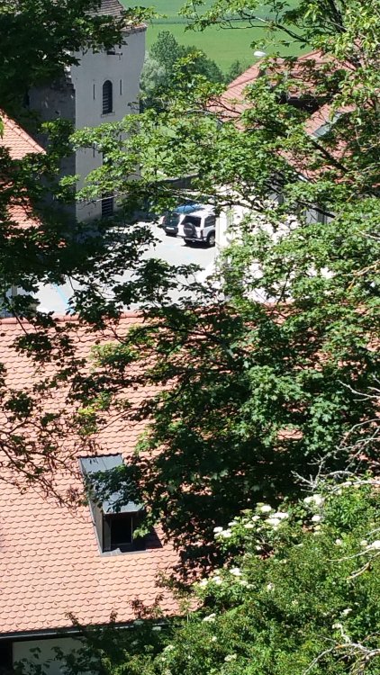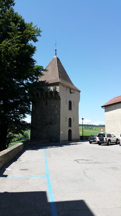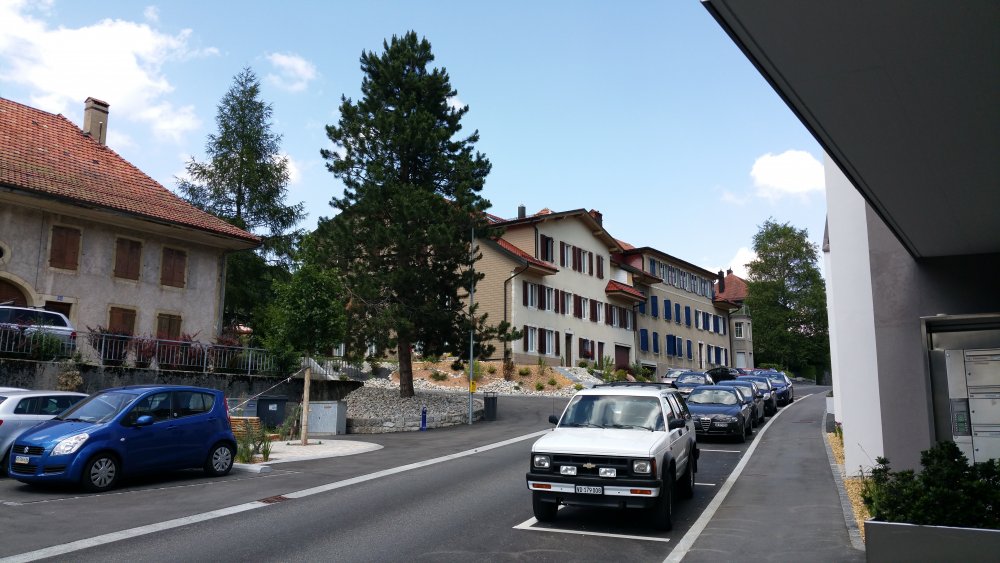 Merci!!! Bon ben que du bonheur quoi, un peu plus de 200 bornes aujourd'hui, tout cela naturellement sans encombre, la routine s'installe! Une bonne petite virée achats pour le garage et déménagement de la grand-mère (donc chargé raz la gueule) et ensuite virée resto pour la graille de midi du côté de Romont dans le canton de Fribourg... Et même depuis la terrasse je garde un oeil sur la bête: Et enfin voilà l'occasion de faire des photos sympa!!! Au détour du cruising, j'arrête les deux tonnes de tôle là, et merde, c'est beau: Comme quoi, quand la citrouille se transforme en carrosse... Il est génial ce bahut, que du bonheur vraiment, je l'adore! ça faisait longtemps que j'avais pas autant pris mon pied dans une bagnole! Demain? Le plein, un coup sur le parebrise et 200 autres bornes! Minimum. Youpie!