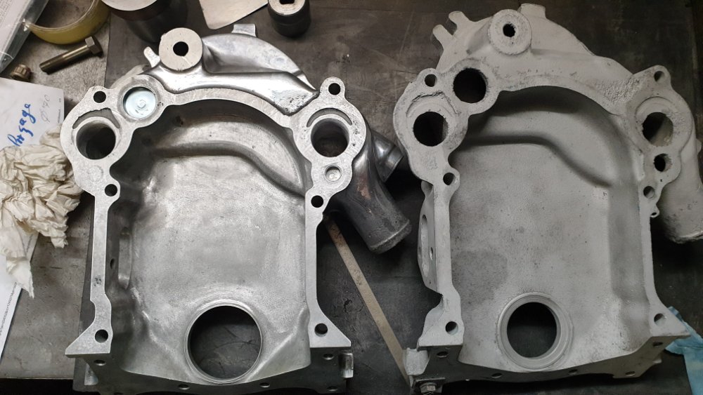 Pour l'instant rien de passionnant, j'ai reprit le polissage du carter de distribution. Car je l'avais fait de manière à dégrossir le travail, sans trop de finition. Bien sur j'ai laissé certains défauts de fabrication , vu que pour les faire disparaitre il me faudrait vraiment rentrer en profondeur et y passer un temps pas possible. Une fois en place on ne verra pas grand chose mais cela devrait être raccord avec les caches culbuteur. J'ai également rechargé en époxy l'entrée d'eau qui était bien attaquée par la corrosion. Même chose pour les caches culbuteurs, ces pièces sortant des moules d'époques de façon artisanale sont loin d'être parfait. Donc même punition, il faut y passer quelques heures dessus. Ici on voit très bien que le ponçage avant polissage a été bâclé. Donc un coup de chignole. Puis ponçage à la main avec du 400 à sec. Idem sur les puits de fixation. Avec un peu de travail, c'est mieux. Là c'est la portée du joint du bouchon. Avec une perceuse à colonne et un disque abrasif voilà ce qu'il est possible de faire. Voilà pour un des caches culbuteurs, le polissage va pouvoir commencer.