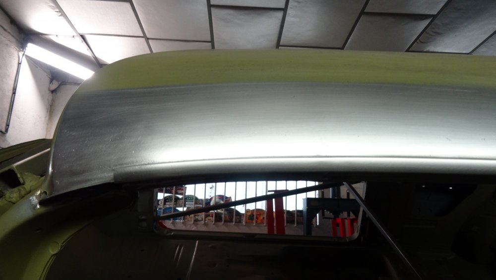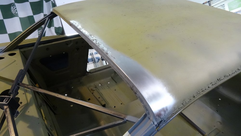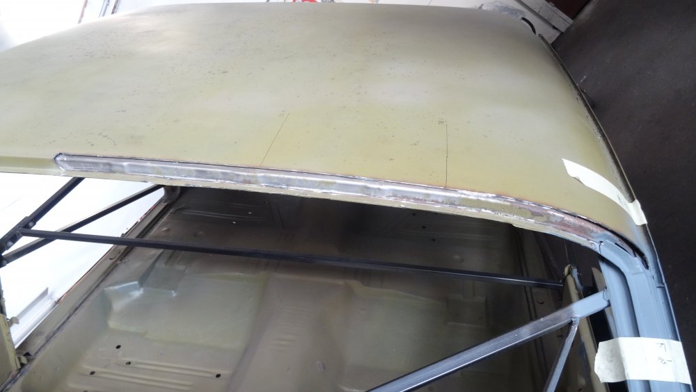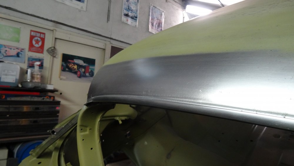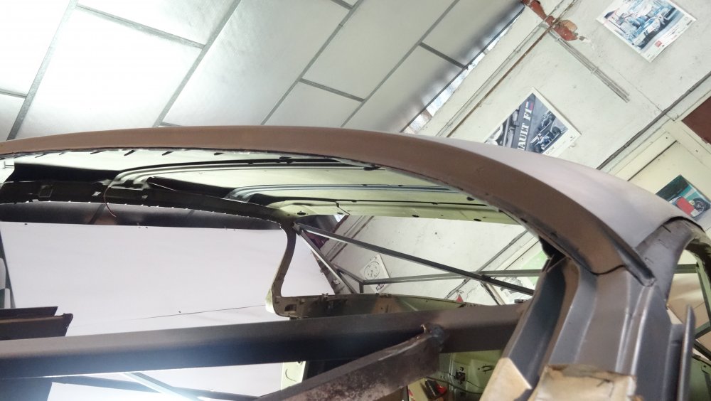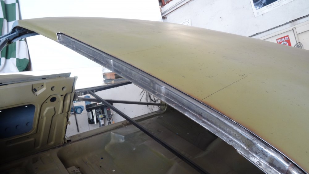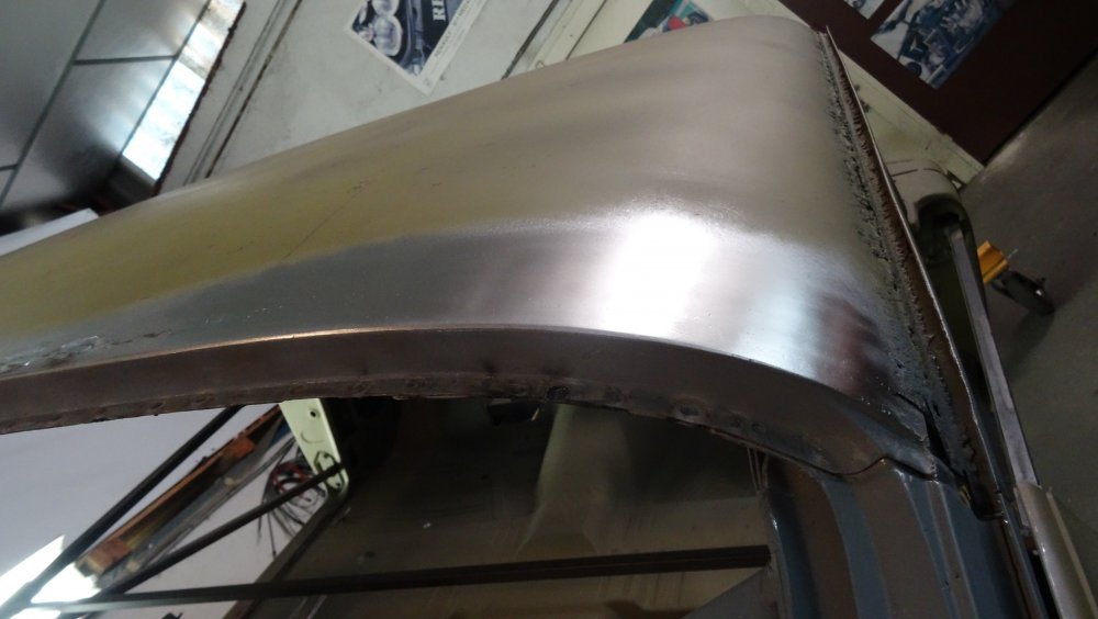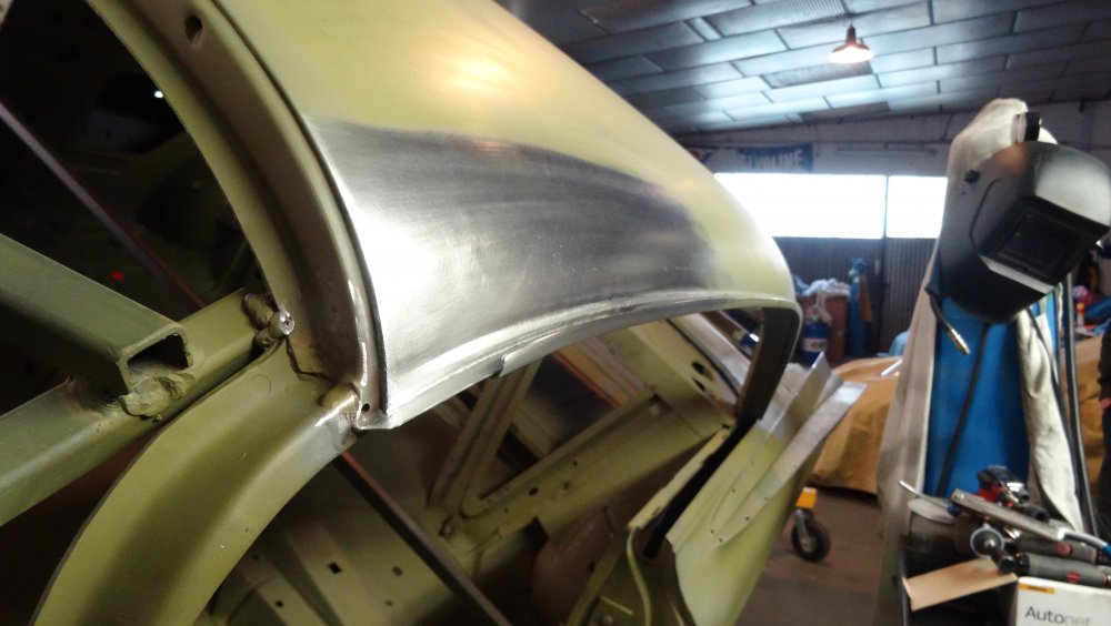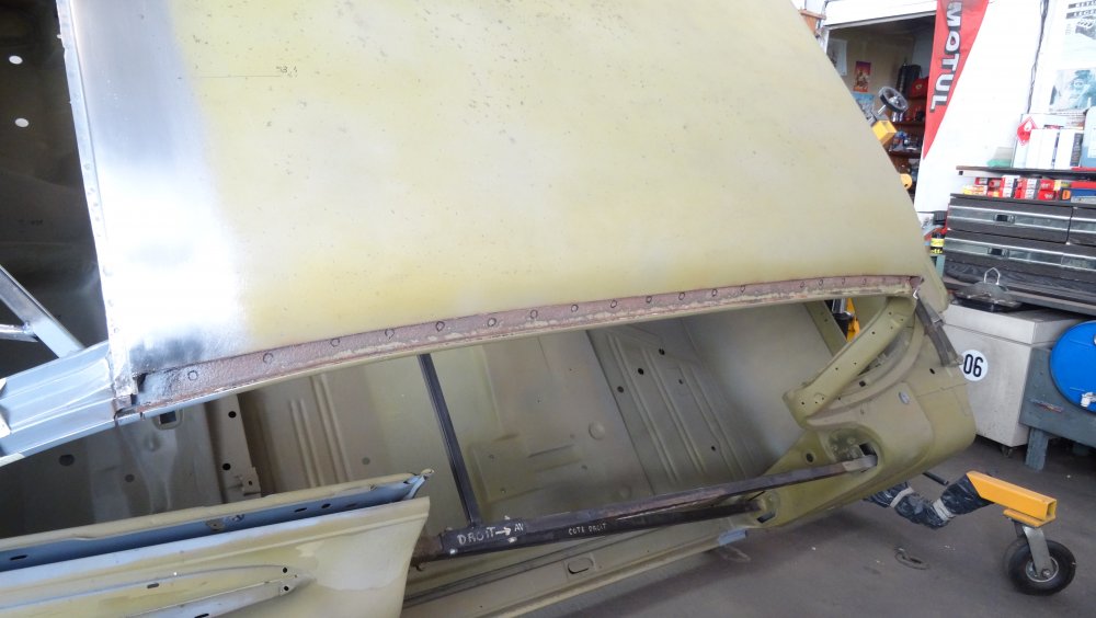 Reprise du dégrossissage pour finir le remise en forme définitive. Cela progresse bien. J'ai fait un petit cordon de soudure pour diminuer une bosse. Bien les boules car cela demande un gros taf pour revenir au même niveau. Puis soudure par point de la gouttière avec le pavillon. Cette fois-ci c'est terminé pour le pavillon. Vue de l'avant c'est également correct. La moulure qui maintient la baguette est correctement alignée. J'ai pris soin de maintenir le pavillon pendant le soudage par point. Voilà c'est enfin terminée pour ce pavillon.