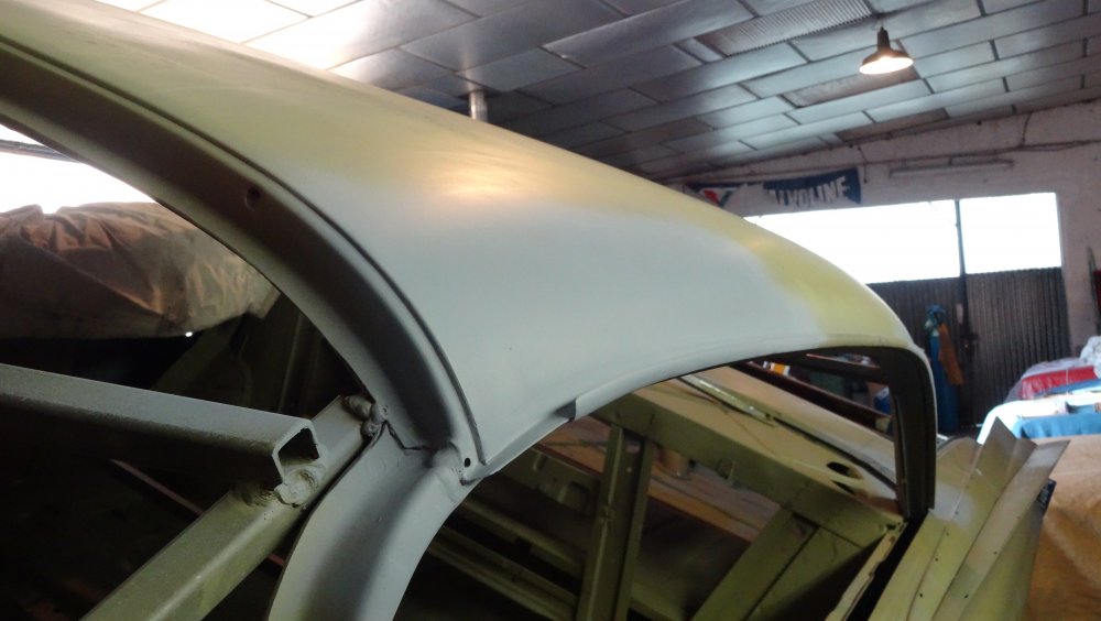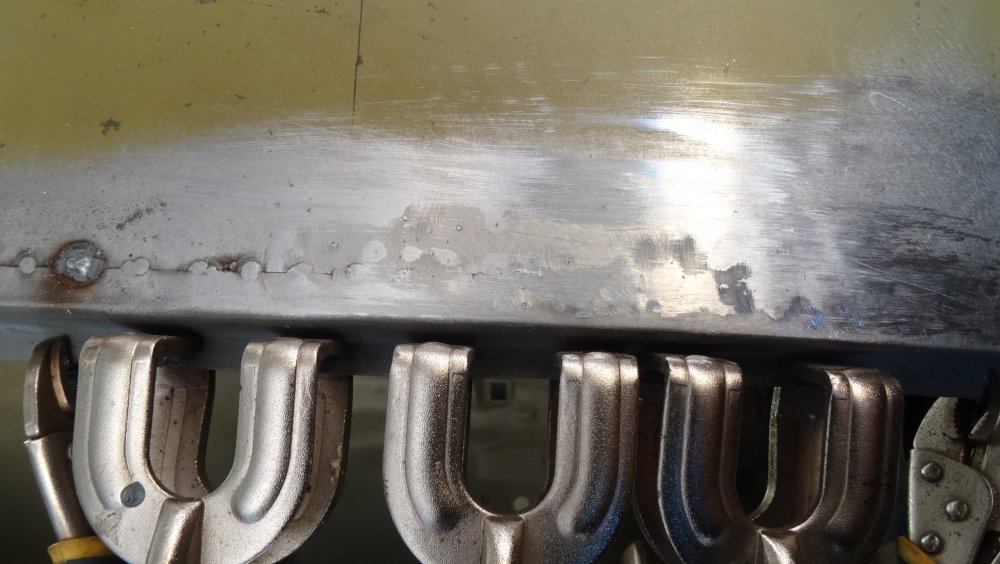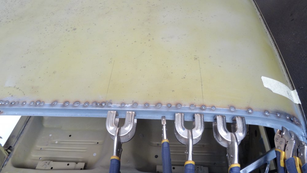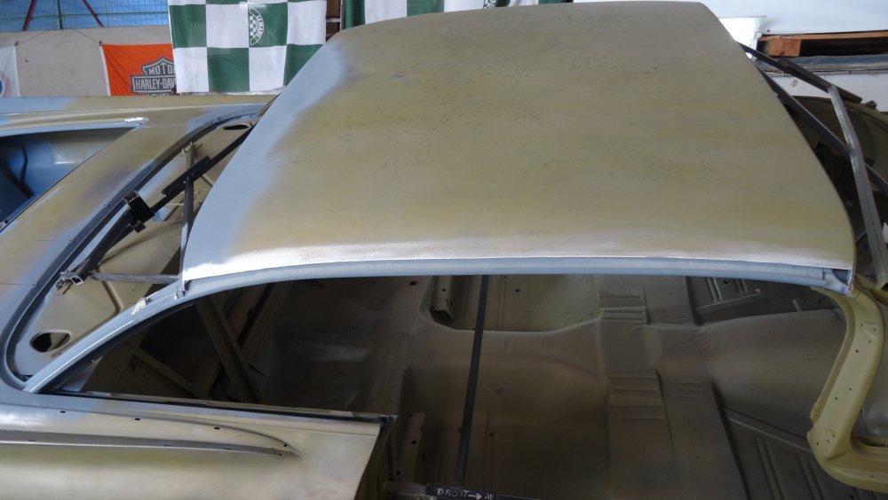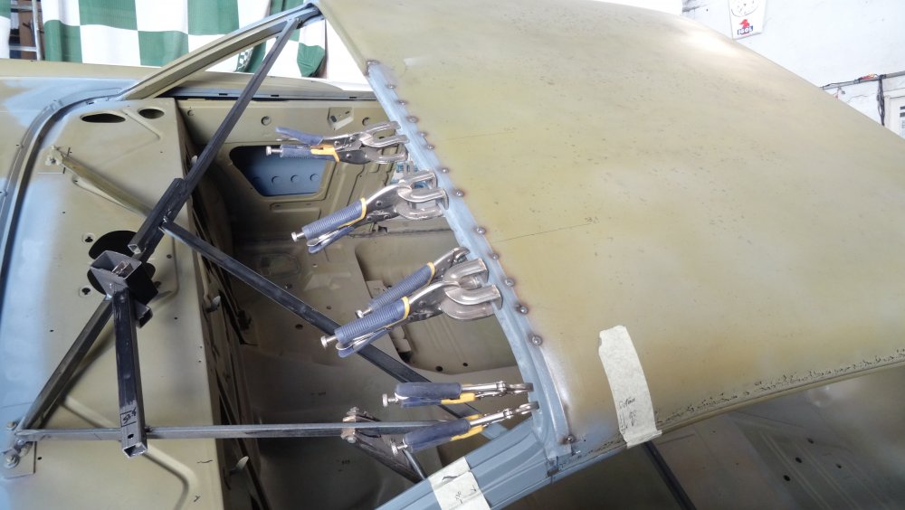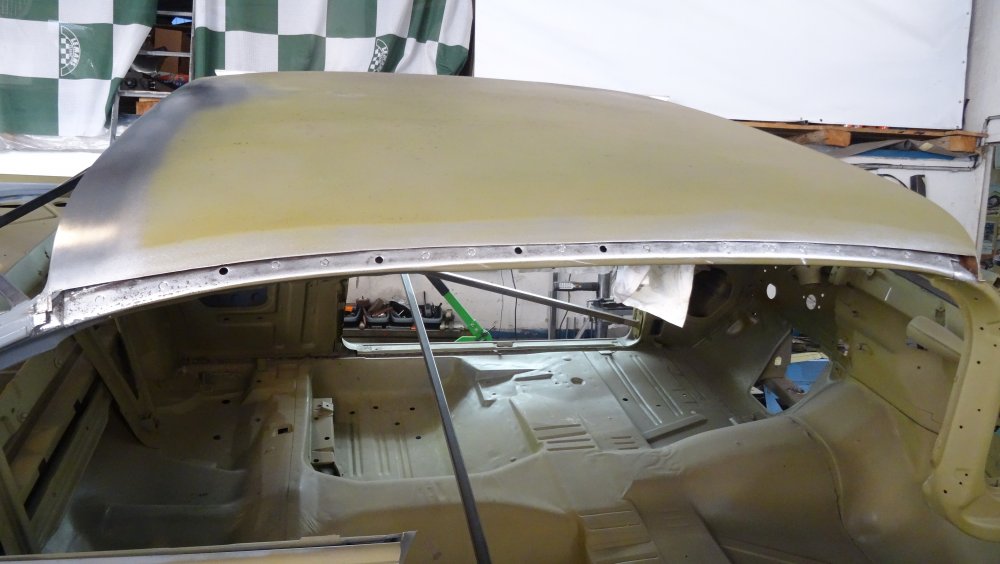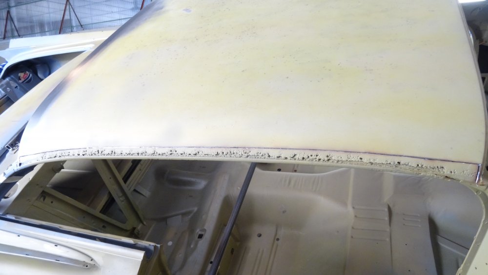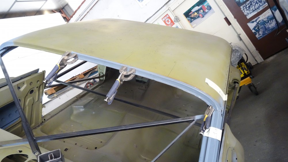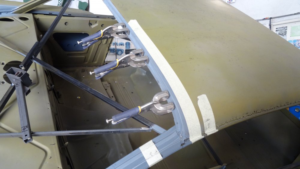 Reprise du dégrossissage pour finir le remise en forme définitive. Cela progresse bien. J'ai fait un petit cordon de soudure pour diminuer une bosse. Bien les boules car cela demande un gros taf pour revenir au même niveau. Puis soudure par point de la gouttière avec le pavillon. Cette fois-ci c'est terminé pour le pavillon. Vue de l'avant c'est également correct. La moulure qui maintient la baguette est correctement alignée. J'ai pris soin de maintenir le pavillon pendant le soudage par point. Voilà c'est enfin terminée pour ce pavillon.