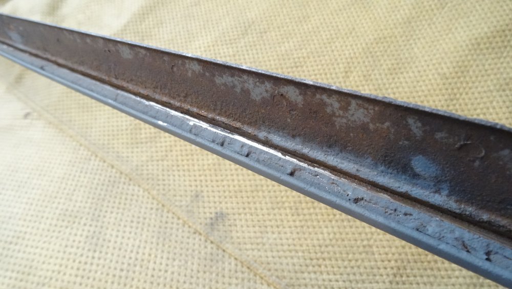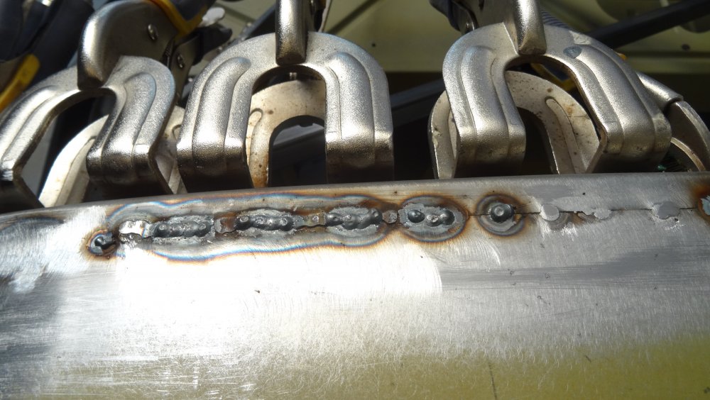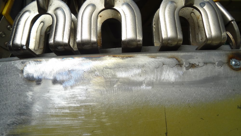 Les cent vingt cinq centimètres de soudure sont fait . Après meulage et vu de prêt cela donne ça. Mais vu de plus loin, et après un coup de ponceuse et de rappe. C'est beaucoup moins drôle. Vraiment moins drôle. En foncé les bosses en gris clair les creux.
