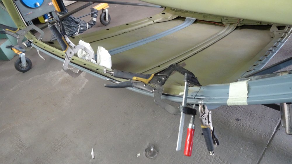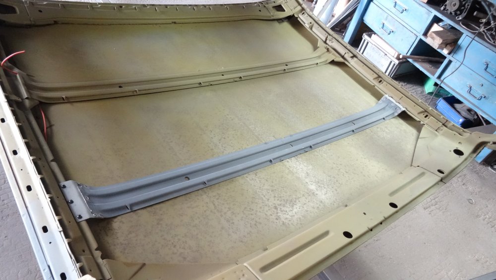Pour réparer le pavillon, j'ai décidé de faire le patch en deux parties. Cela rend l'ajustage et le formage plus facile. Pour démarrer, une tôle avec une moulure au centre faite avec la bordureuse . Puis un pli, pour reproduire le fond de la gouttière. Les dimensions peuvent sembler exagéré ce qui va aussi donner de grosses chutes. Mais cela m'aide pour le formage. Puis une première découpe. Je reprend la pièce à la plieuse pour la cintrer. Progressivement j'obtiens la courbe voulu. Une autre coupe pour ce rapprocher de la vérité . La pièce est maintenant cintrée. Énième mise en position, cette fois c'est la bonne . Le patch est pointé, c'est partie je ne peux plus reculer. Ajustement de la deuxième pièce. Avec un peu de travail la pièce tombe bien. L'autre bout aussi. La nouvelle pièce tombe bien et peut être à son tour pointée. Le pointage est fait. La pointe coté pare-brise est également réparée. Du côté de la lunette arrière même chose. Reste les finitions a faire. L'ensemble est pointé, les premières déformations sont déjà présentes. Entre le pavillon et le montant j'ai intercalé en force des chiffons. Afin de positionner au mieux le pavillon qui a tendance à ce refermer sur lui-même. Donc pour l'instant je ne soude pas le fond de la gouttière, ce qui me donne un peu de latitude pour réaligner les patchs pendant les soudures. Mais bon c'est chaud à faire, cela représente une soudure de plus d'un mètre vingt de long. Je pense pratiquer de la même manière que la dernière fois. En débutant d'un bout et en redressent par petites sections d'une quinzaine de centimètre à la fois.