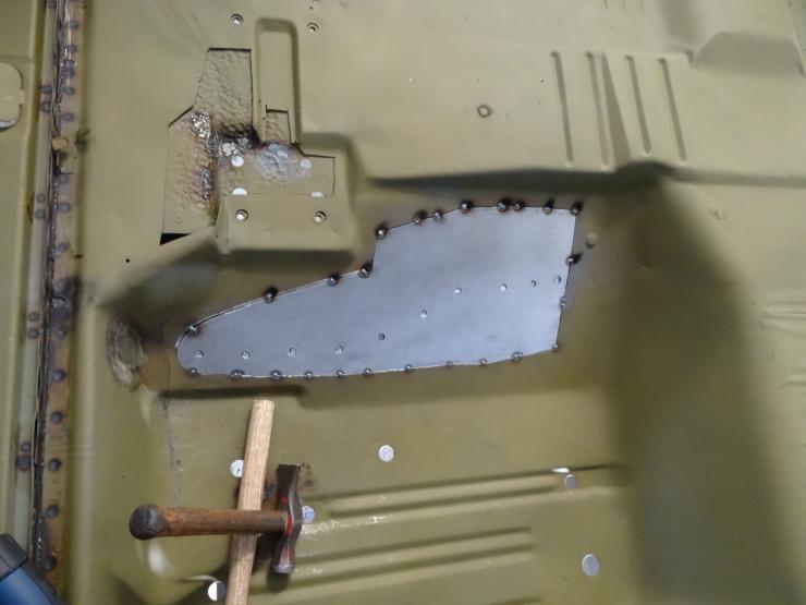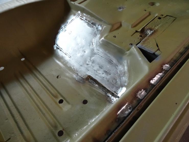 Voici la suite, réparation du plancher avant droit au niveau des pieds passager. Découpe et dé-pointage. Décapage. Traitement curatif. Là, je triche avec un morceau identique de Chevrolet 59' et 60' Après ajustage.