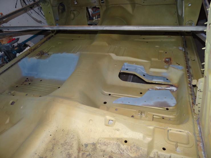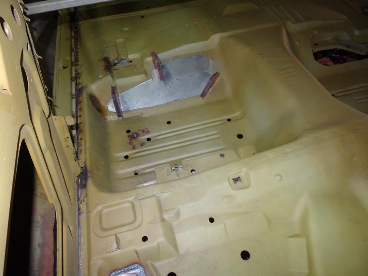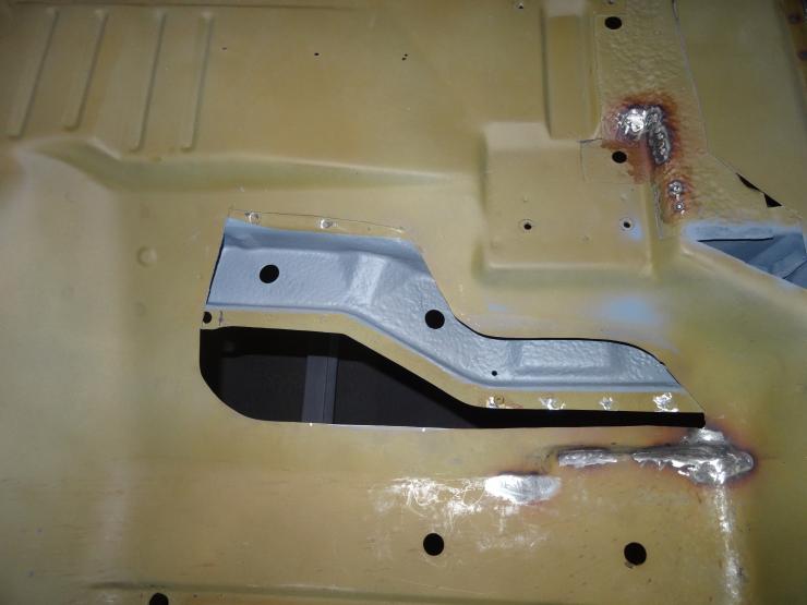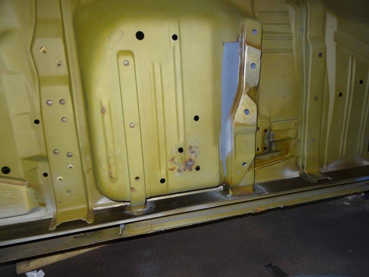 Cela ne se voit pas vraiment, mais les parties restantes à découper et à refaire sont celles tracées en jaune. En rouge les morceaux de plancher réparés. Tant que je n’avais pas sablé le plancher, il semblait plutôt correct, hormis sous la banquette AR.. Mais après sablage des centaines de petits trous sont apparus et par endroit le métal restant est très faible. Heureusement c'est sur des zones bien défini donc facile à remplacer. Comme je veux que cette coque retrouve toute sa rigidité. Je ne peux pas me contenter de mastiquer par-dessus pour simplement faire disparaître les trous. Pour les réparations j’ai pu trouver deux morceaux neuf de Chevrolet 59-60, dont un seul nécessite une petite modif pour être conforme au modèle Pontiac. Le reste sera reproduit comme précédemment. Rouler avec, après réparation était mon premier objectif. Puis ayant découvert au sablage le passage de roue avant gauche mangé par l'acide et l'aile d'occasion bien rouillée et magouillée. Je me suis dit qu'il valait mieux mettre tout en chantier car le temps défilait trop vite. Mais avant je devais finir des chantiers en cours et préparer celui-ci.