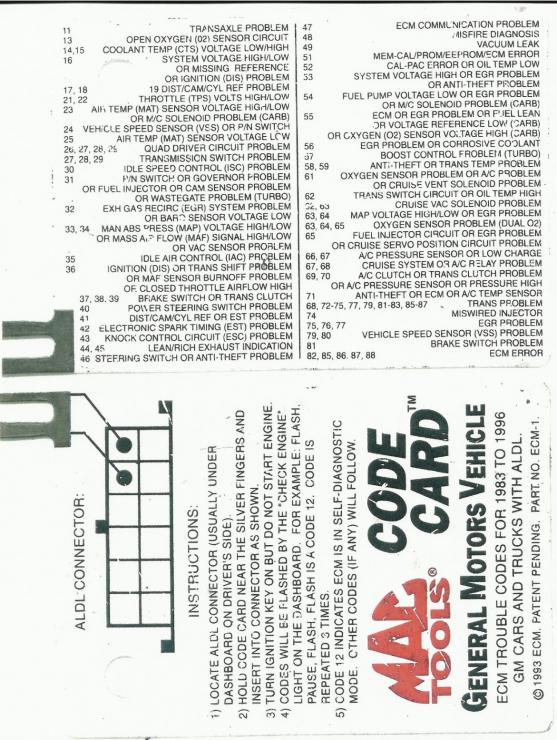 Pit Posté(e) le 3 février 2014 Signaler Posté(e) le 3 février 2014 (modifié) Voici une petite carte avec les codes défauts qui peuvent êtres lu en pontant le prise ALDL: D'un côté le descriptif de le prise et le mode d'emploi. De l'autre, la liste des codes. Bien utile pour commencer un diagnostic! Merci à Jean-Claude pour le partage! Modifié le 7 mars 2015 par Pit Citer