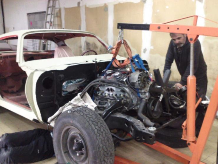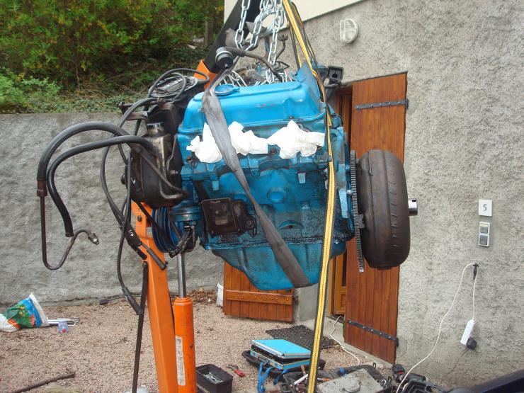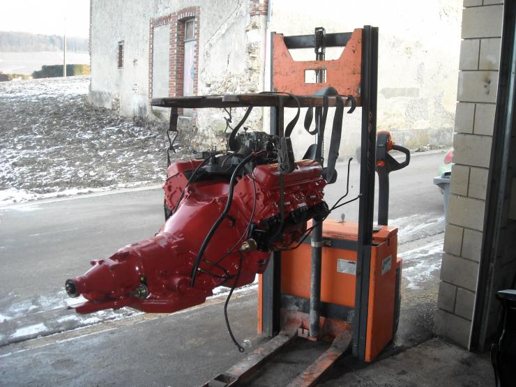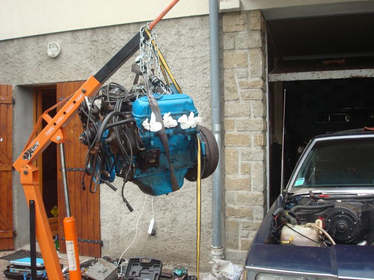 Pour un V8, tu dévisses 2 boulons de fixation opposés de la pipe d'admission sur les culasses, et tu les revisses après avoir enfilé chacun dans un maillon d'extrémité d'une chaîne.