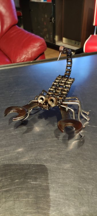 exNISSAN Posté(e) le 25 février 2021 Signaler Posté(e) le 25 février 2021 Oui , avant d'assembler je décape bien la ferraille avec une meuleuse + brosse à fil et après , sur les petites pièces je met un coup de verni en bombe ,ça fait bien ressortir le métal nu . Pour les meubles vu le volume nécessaire je prend carrément du verni à boiseries extérieures (ceux avec lesquels on nettoie les outils à l'eau ) ,au pinceau car c'est moins onéreux et ça tient correctement dans le temps Pour les bibelots je pompe les idées sur le net ; Et à côté de l'établi j'ai 2 seaux pour mes déchets de mécanique , un pour la ferraille direction déchêterie , et l'autre pour récup pour réaliser des bricoles ; et quand je décide de m'y mettre je vide le seau et je regarde ce qui est faisable . Alors ce matin j'ai fait un second scorpion pour ma belle fille (vu qu'elle avait posé une option quand elle a vu une photo du premier ) , je l'ai fait un poil différent ! J'ai un pote garagiste 4x4 , il fait régulièrement pour son club des Trophés avec des pièces cassées , ils sont remis à l'occasion aux malchanceux (ou aux bourrins !) qui cassent un truc lors d'une sortie (trophé du différentiel pété , ect....) Phil sebastien 01, bengalaxie et pat060 3 Citer