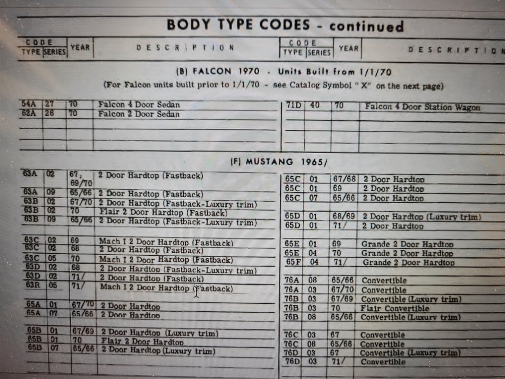 Geo80 Posté(e) le 28 septembre 2023 Signaler Posté(e) le 28 septembre 2023 Bonjour à tous J’ai acquis une mustang de 1970, importer De NY. Cette voiture fait l'objet d'un restauration complète. Afin d'identifier les pièces que je démonte, j’ai acheté une doc technique complète. Le problème c’est que je n’arrive pas à identifier de façon formelle le ‘ body type ’de ma voiture. J’ai fait beaucoup de recherche à ce sujet. Voici mes déductions : Le body type présent sur la photo 9 (certif d’importation) correspond à "2 doors", mis par l’importateur. Il n'est pas un type existant. Le VIN présent sur la plaque de la voiture est correct au document d’importation, je l’ai retrouvé sur une plaque en bas du pare-brise. Le vin partiel est correct aussi (photo 1). En photo 3 vous trouverais les Body type existant En photo 7 j’ai mis un exemple d’une recherche que j’ai faite sur le parebrise, j’ai le choix entre 3 types de body (63,65 ou 76) Je penser le trouver garce au numéro Vin mais il n’en fait pas partie (voir photo 😎 Je n’ai pas trouvé la plaque de la photo 8, peux être en papier et détériorer. La photo 2 correspond au-dessous du capot. J’ai mis des photos d’ensemble de la voiture, en espérant que sa peux aider. Quelqu’un aurait une idée pour identifier mon Body type ? Citer