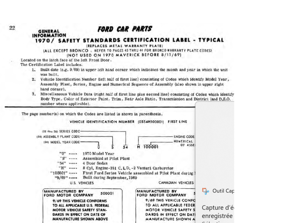 Charger976 Posté(e) le 28 septembre 2023 Signaler Posté(e) le 28 septembre 2023 Voilà tout est dit! Pour le reste le premier VIN decoder venu te donne: 0: millésime 1970 F: assembly plant de Dearborn 01: HardTop (appelé aussi Notchback certaines années). Bref ce n'est pas un Sportroof ni un convertible, mais il suffit de regarder les photos. L: moteur L6 250ci, carbu 1V, 155cv. Le "secretary six" bien sympa mais pas de quoi faire des burns...Quoique... 157384: 57384ème exemplaire sorti des chaînes de montage. sebastien 01 et Geo80 1 1 Citer