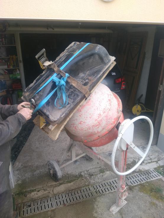 Olds 60's Posté(e) le 24 mars 2017 Auteur Signaler Posté(e) le 24 mars 2017 aujourd'hui j'ai attaqué le nettoyage du réservoir avec l'aide mon papa fabrication d'un support pour la bétonnière afin d'y accrocher le réservoir afin de le faire tourner sans se fatigué je pensait le fixer avec 2 sangles autour mais c'est plus compliqué que ça car en tournant, ça coince avec la crémaillère qui tourne, il faut qu'il soit maintenu uniquement sur la partie haute, du coup on à fabriquer une platine à l'aide de quelques bout de bois et 2 sangle pour tenir l'ensemble. Il à fallut également faire 2 bouchons pour boucher le trou de la jauge et celui du tuyaux de remplissage. On à fait 3 nettoyages de 15minutes avec 10l d'eau et un seau de caillou pointu avec afin de décoller la rouille et les vacheries. Ensuite une fois l'eau clair, on à enlever les cailloux et fait le 1er traitement restom, 1l de dégraissant mélanger à 10l d'eau très chaude afin d'enlever tous les résidents d'essence et d'huile et on remue de temps en temps pendant 5h. Impressionnant les gaz qui on sortis lorsqu'on à mis ça dans le réservoir demain traitement destructeur de rouille puis ensuite application de la résine. Citer